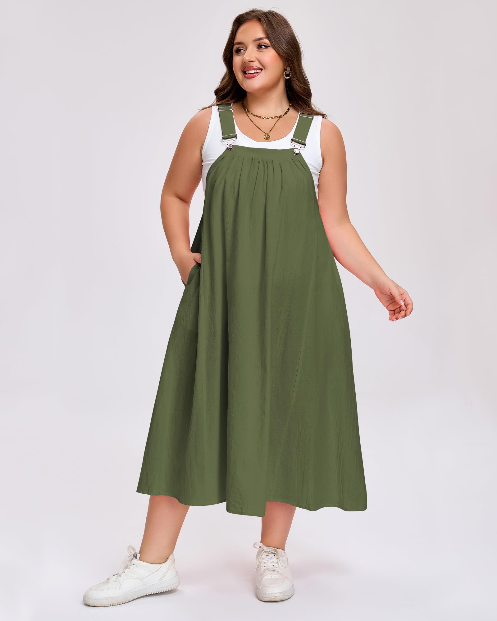 Embrace effortless style and all-day comfort with the Moon Wood Plus Size Cotton Overall Dress in Army Green. Designed for the modern woman who values both fashion and function, this versatile jumper dress is your new go-to wardrobe essential. Crafted from soft, breathable cotton, it keeps you comfortable during any activity.