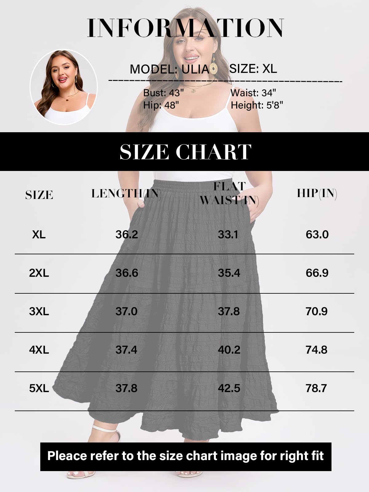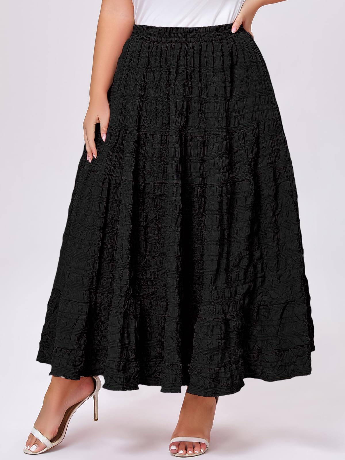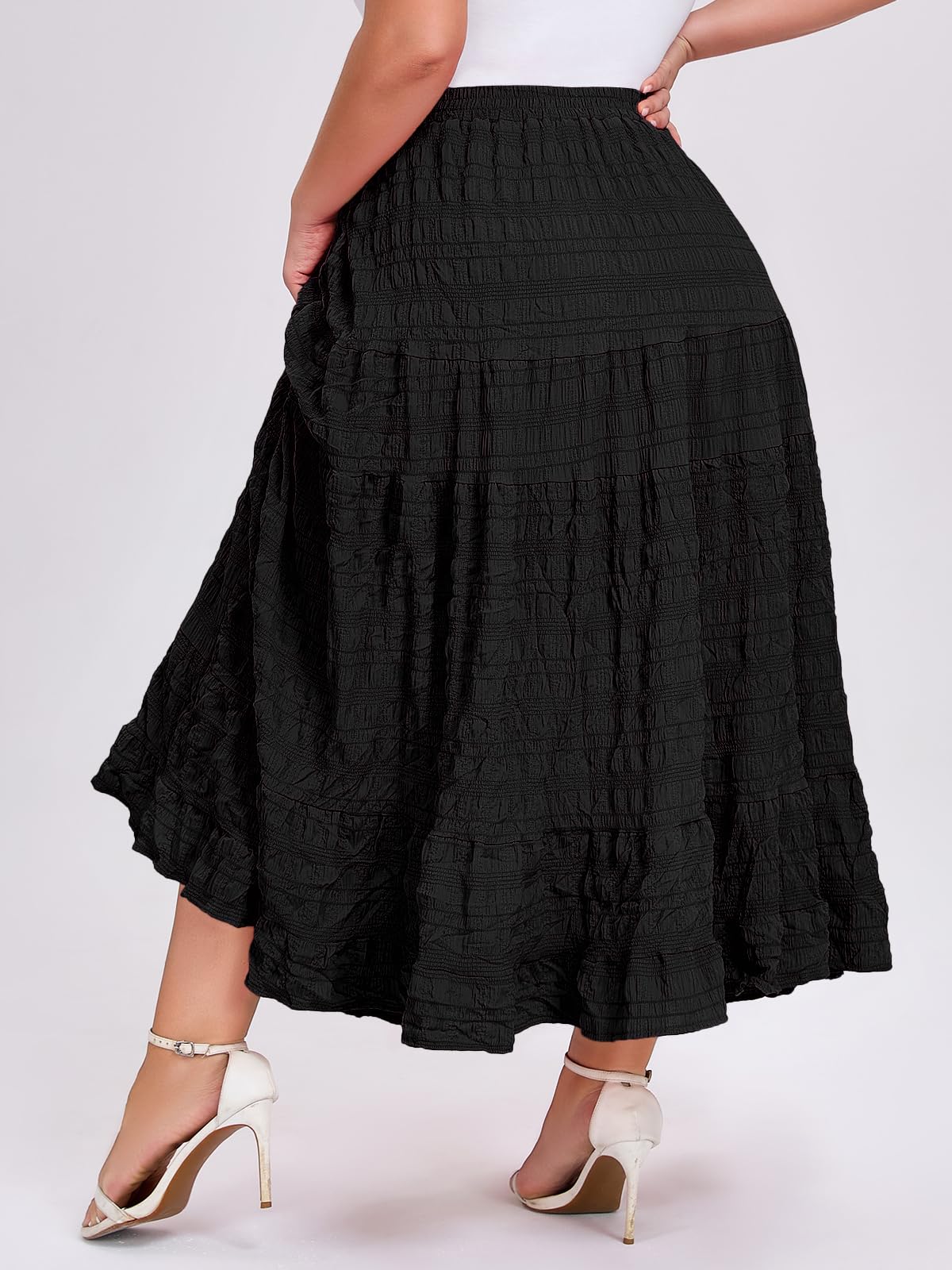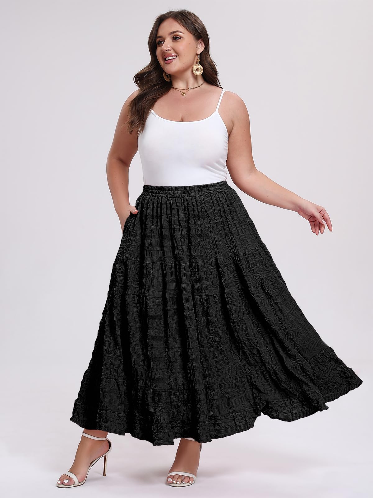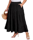 Elevate your style with Moon Wood's Plus Size Maxi Skirt in timeless black. Designed for comfort and effortless elegance, this A-line skirt features a beautifully tiered, multi-layer ruffled hem that adds a flowy and lively movement to every step. The soft, elastic waistband ensures a perfect, comfortable fit for various body shapes without any tightness. Thoughtfully designed with deep, practical side pockets, it conveniently holds your essentials like a phone or keys. Perfect for creating versatile, chic looks for any occasion.