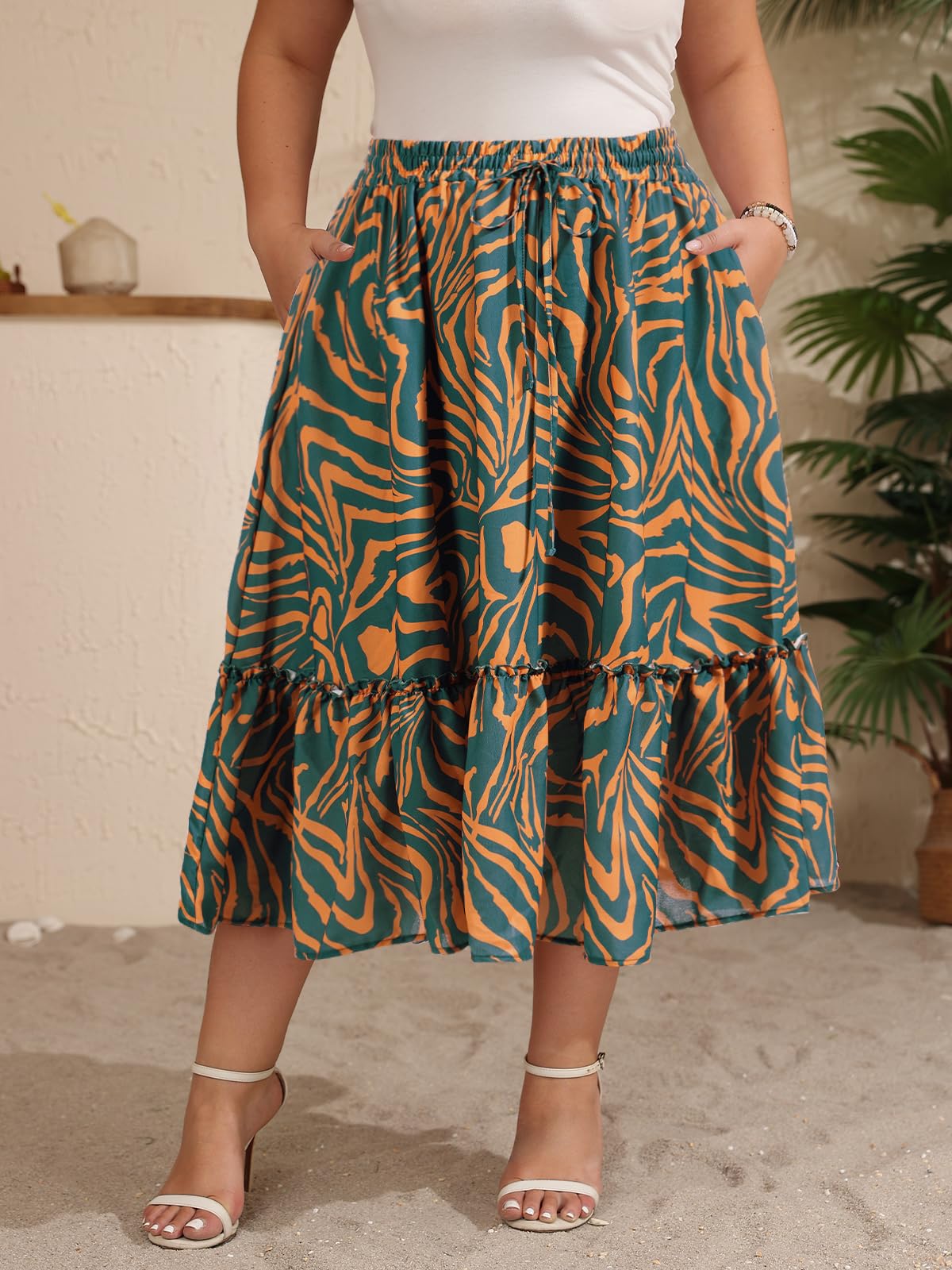 Dieser Sommer-Midirock für Damen in Übergröße mit hoher Taille ist eine vielseitige und stilvolle Ergänzung für jede Garderobe. Der Rock verfügt über ein hoch tailliertes Design, das Ihrer Figur schmeichelt, und eine Midi-Länge, die Schutz bietet, ohne auf Stil zu verzichten. Dieser aus hochwertigen Materialien gefertigte Rock ist bequem und perfekt für warmes Wetter. Die grün-weiße Farbkombination ist klassisch und lässt sich leicht mit einer Vielzahl von Oberteilen und Schuhen kombinieren.
