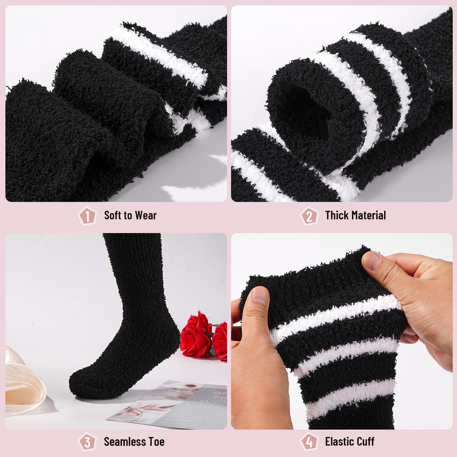 Embrace timeless style and cozy comfort with our Coral Fleece Striped Thigh High Socks. Featuring a classic black and white striped pattern, these versatile socks can be styled as thigh-highs or knee-highs to effortlessly complement your wardrobe. Perfectly paired with mini skirts, shorts, or leggings, and easily worn with heels, sneakers, or boots, they are the ideal accessory to elevate your autumn and winter outfits. Made from soft coral fleece, they provide exceptional warmth without compromising on fashion, making them a must-have for the colder seasons. Add a playful and polished touch to your look, especially for festive occasions like Halloween dress-up.