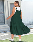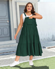 Embrace effortless boho elegance with Moon Wood's Plus Size Bib Overall Dress in Dark Green. Designed with a universally flattering flowy A-line silhouette, this maxi dress features adjustable metal buckle straps and tiered gathering details for a customizable, comfortable fit. Delicate lace trim adorns the chest area and pockets, adding a touch of refined femininity. The layered ruffles and loose, graceful fit create beautiful movement, making it a distinctive outfit that combines style, comfort, and bohemian charm for a truly standout look.