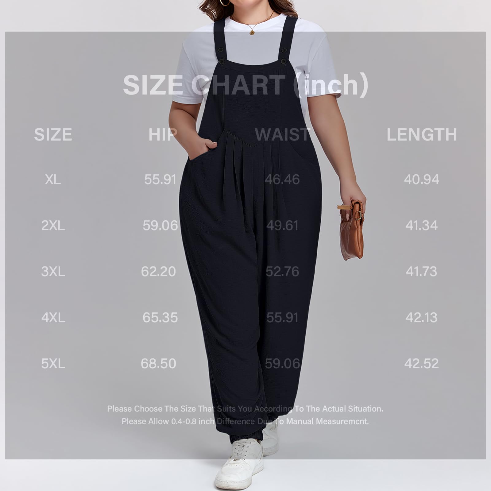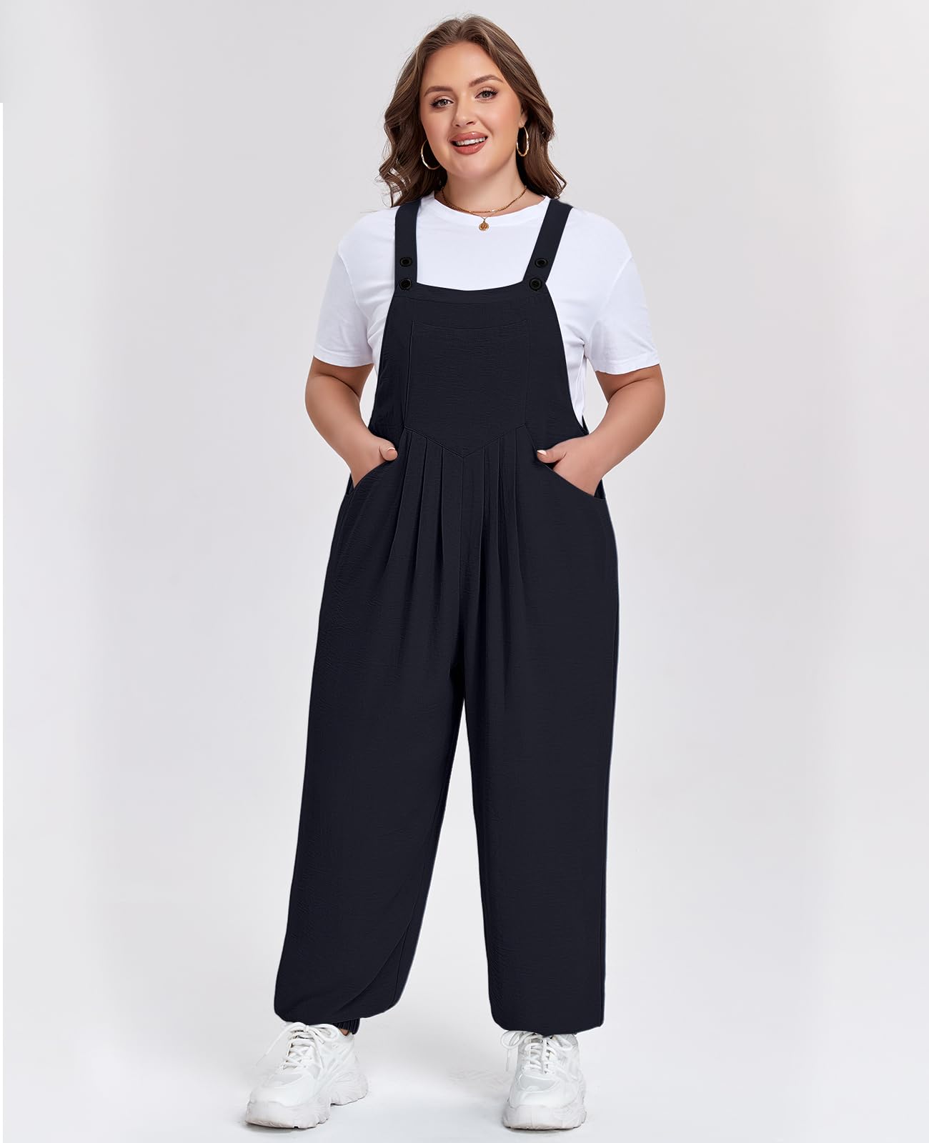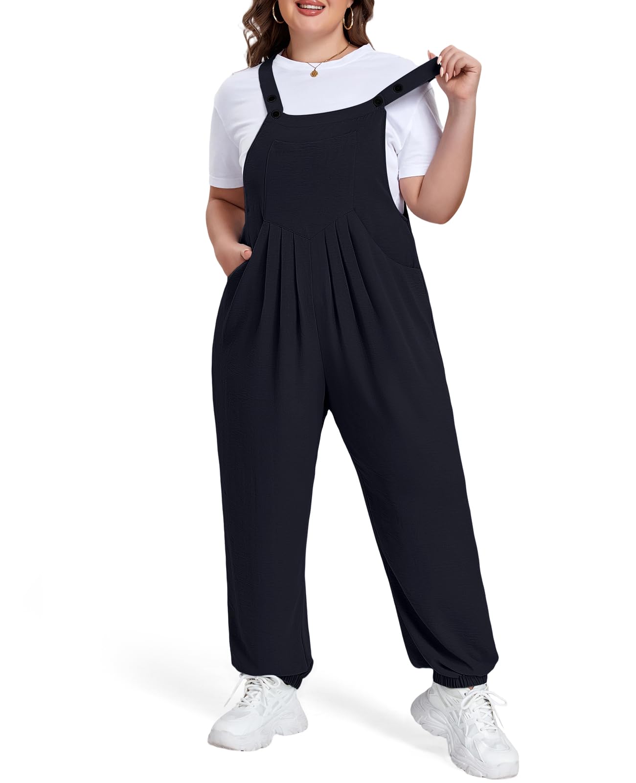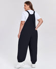 Discover Moon Wood's Plus Size Casual Overalls Jumpsuit in Black, designed for effortless comfort and style. Featuring a flowy, loose-fit silhouette with elasticized hems, this jumpsuit offers a flexible and cozy feel while maintaining a polished look. Adjustable shoulder straps and chest pleats ensure a flattering, customized fit that moves with you. Practical side pockets keep your essentials handy, making it perfect for weekend outings, market runs, or relaxed park picnics. Blending utility with fashion, this clean-lined overalls jumpsuit is a versatile wardrobe staple for the modern plus-size casual wear lover.