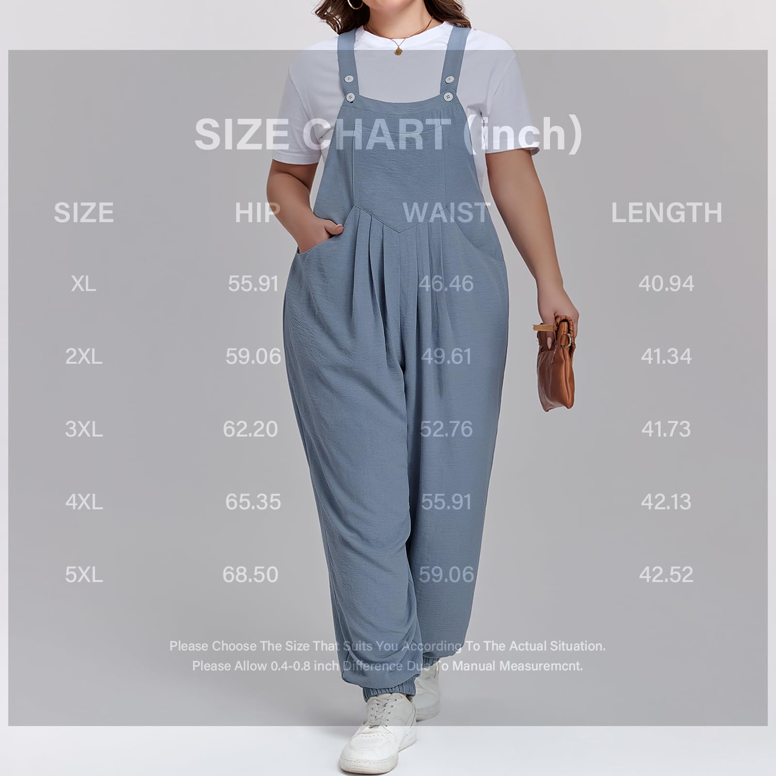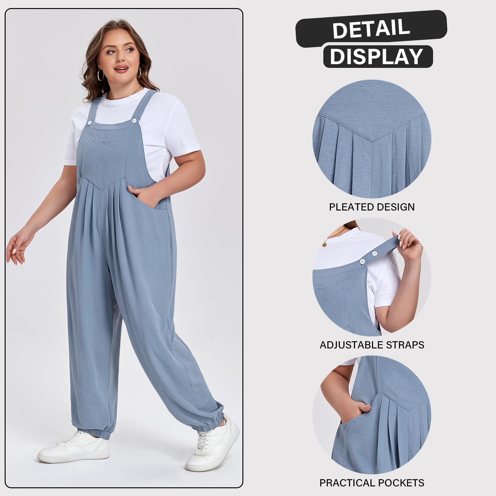 Discover effortless comfort and style with Moon Wood's Plus Size Casual Overalls Jumpsuit in Grey Blue. Designed with a flowy, loose-fit silhouette, these overalls offer a relaxed yet polished look. The elasticized hems and adjustable shoulder straps ensure a flexible, cozy fit that adapts to your shape, enhanced by flattering chest pleats. Practical side pockets keep your essentials handy, making it perfect for casual outings, from flea markets to park picnics. Blending utility with fashion, this jumpsuit is a must-have staple for any plus-size wardrobe, delivering non-restrictive wear without compromising on style.