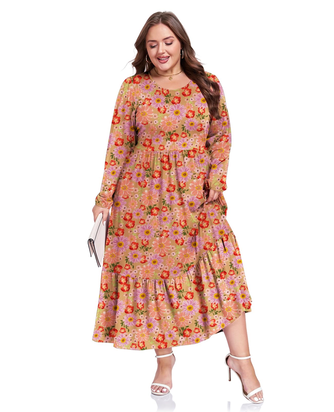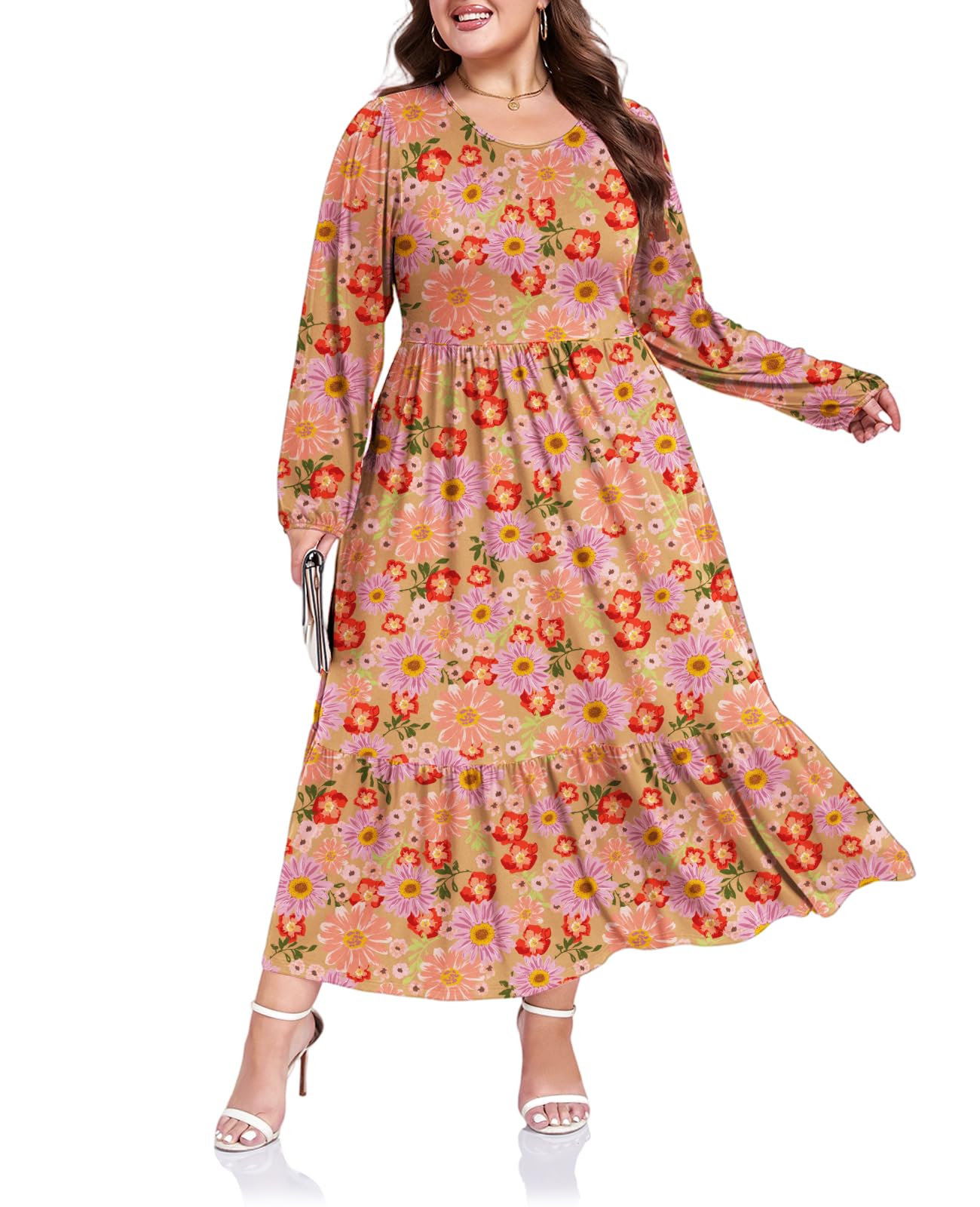 Plus Size Maxi Dress Long Sleeve Crew Neck - Gerbera
