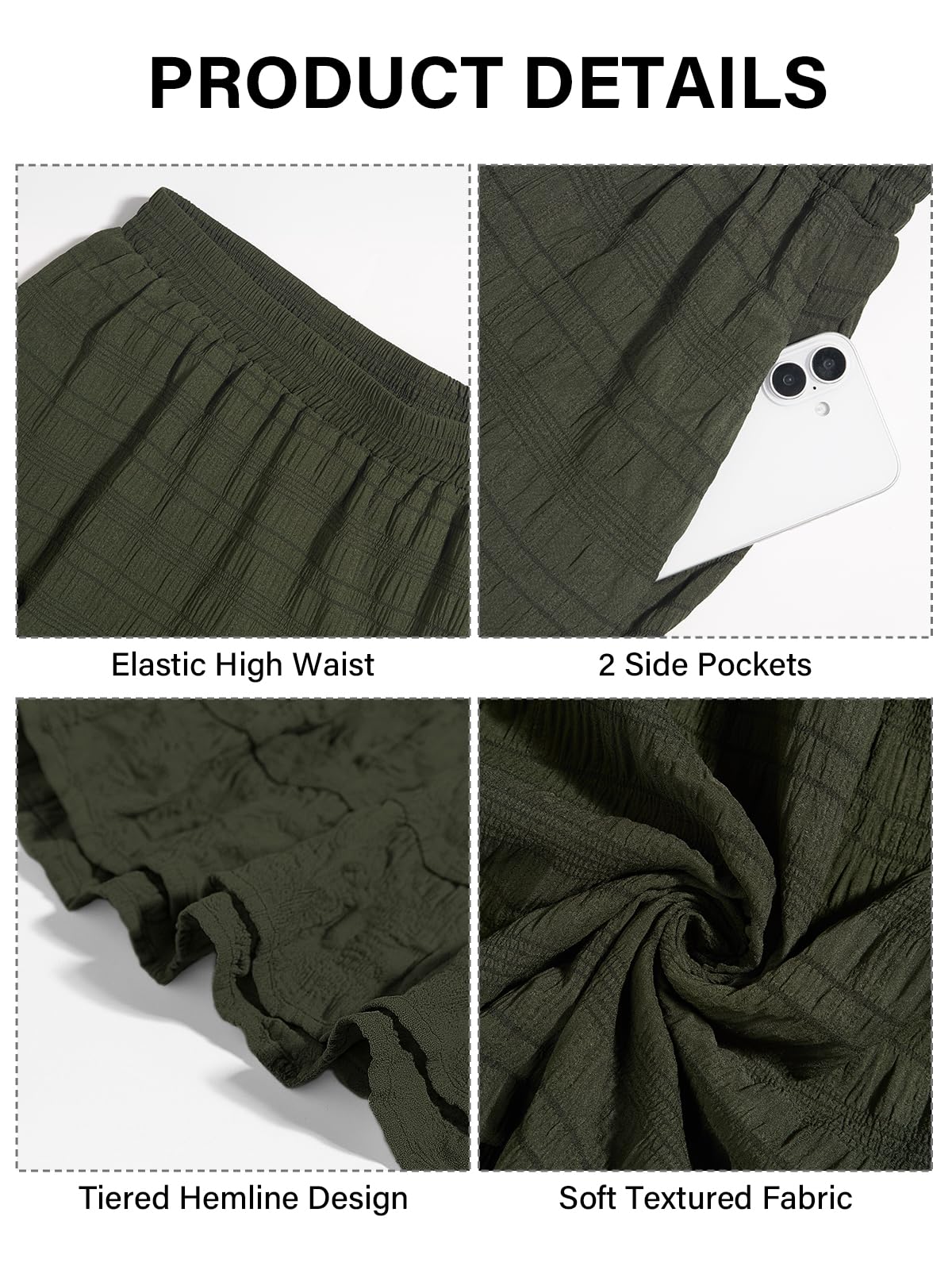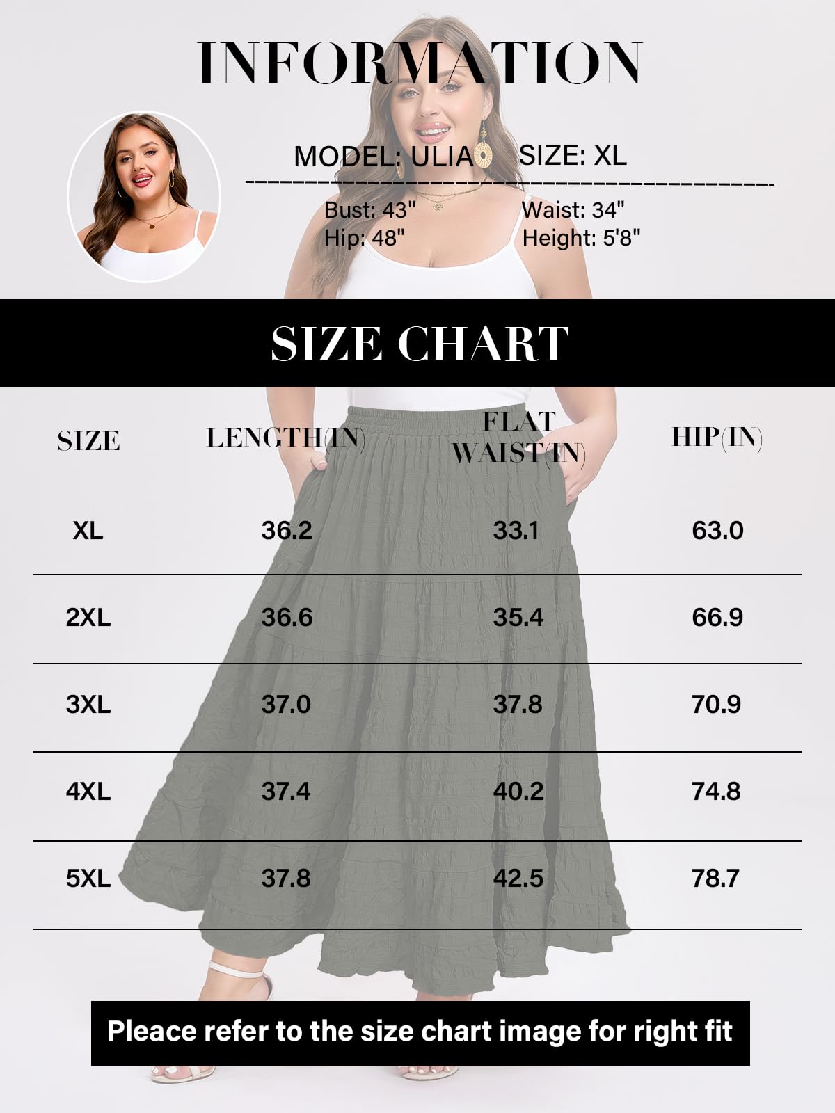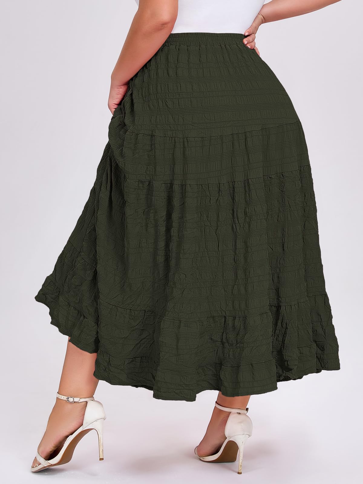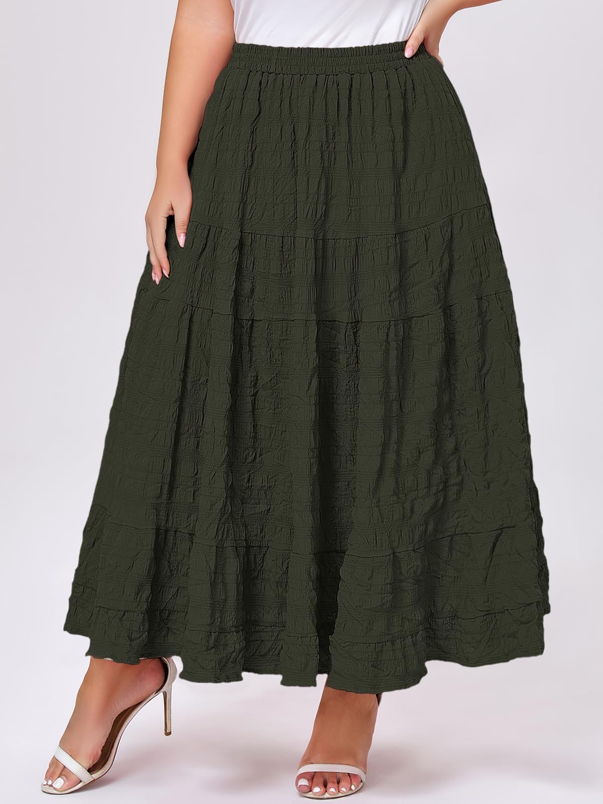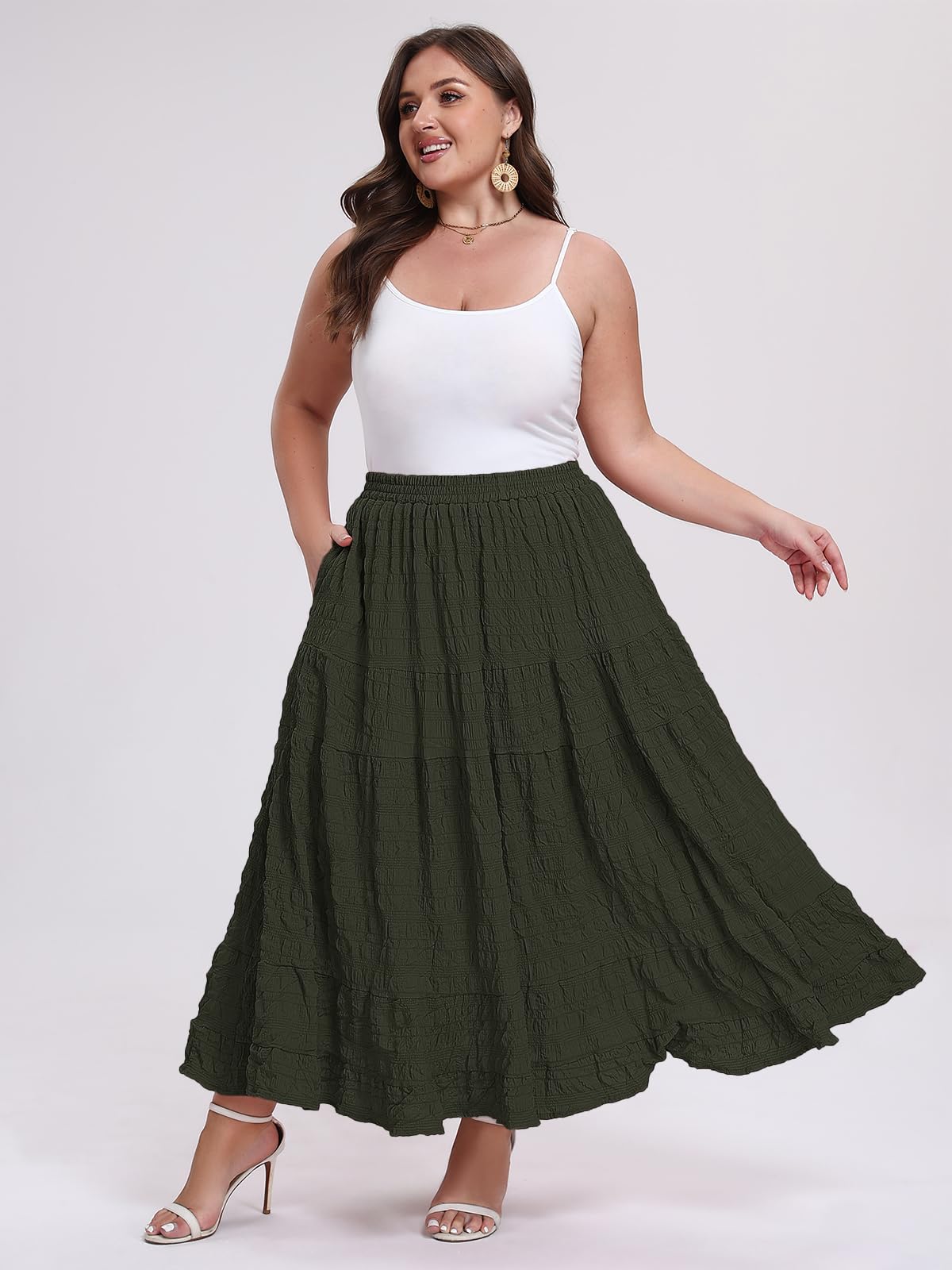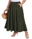 Embrace effortless style with Moon Wood's Plus Size Maxi Skirt in Green. This A-line skirt features a beautifully tiered, multi-layer ruffled hem that adds a flowy and lively movement to every step. Designed for all-day comfort, the elastic waistband provides a flexible, non-restrictive fit for various waist sizes. Thoughtfully crafted with practicality in mind, it includes deep side pockets large enough to securely hold your phone, keys, and essentials. Perfect for creating elegant, comfortable looks for any casual or special occasion.