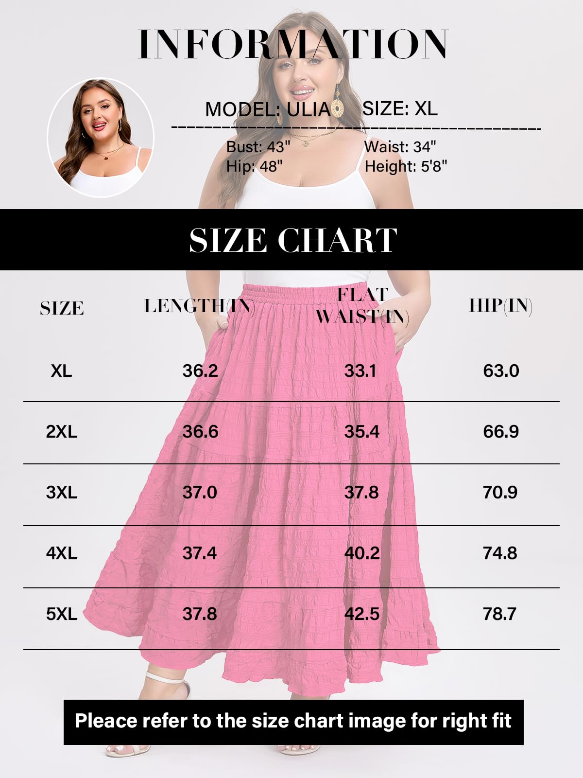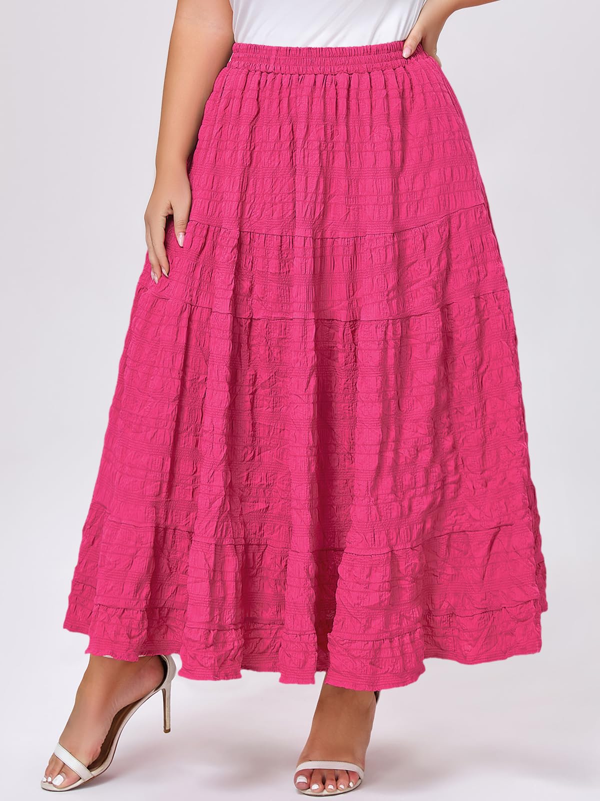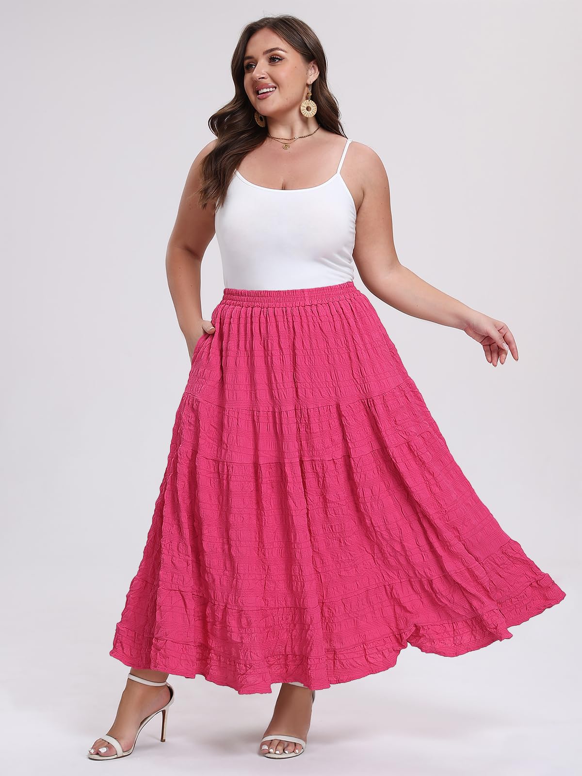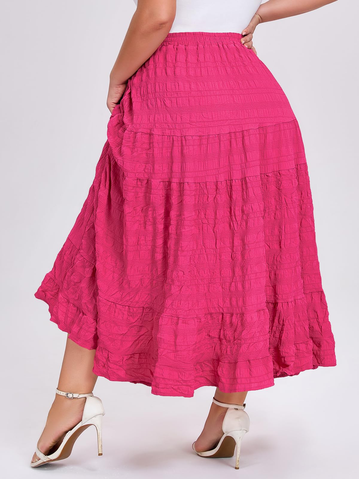 Embrace effortless elegance with the Moon Wood Plus Size Maxi Skirt in Rose. Designed for comfort and style, this A-line skirt features a beautiful tiered design with a multi-layer ruffled hem, creating a flowy and lively silhouette with every move. The soft elastic waistband ensures a perfect, comfortable fit for various waist sizes without any tightness. Perfectly blending fashion with function, it includes deep, practical side pockets large enough for your phone, keys, and essentials. Ideal for casual outings or special occasions, this maxi skirt offers both versatility and timeless charm.