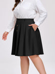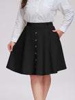 Embrace timeless elegance with Moon Wood's Plus Size Midi Skirt. This high-waisted black skirt features a flattering A-line cut and charming vintage front buttons for a nostalgic touch. Incredibly versatile, it's your perfect year-round wardrobe staple. Pair it effortlessly with your favorite shirts, cozy sweaters, chic blazers, or casual hoodies, and complete the look with boots for any occasion.