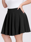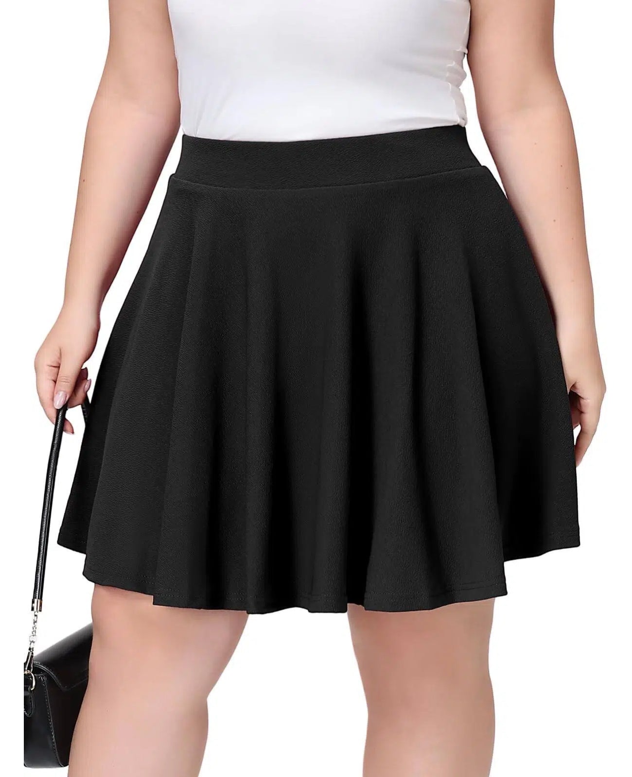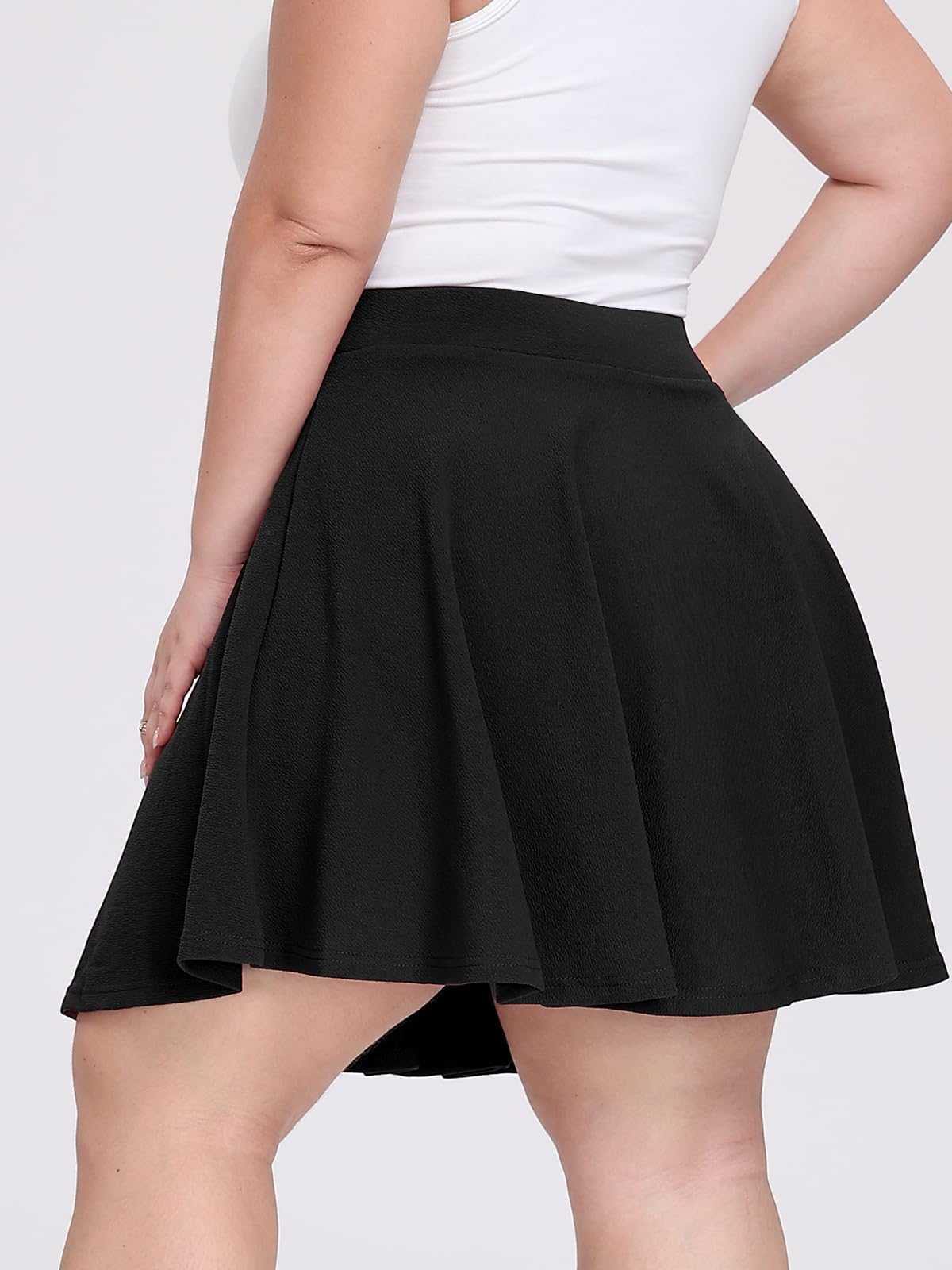Embrace effortless style and comfort with the Moon Wood Plus Size Mini Skater Flared Skirt in Black. Designed to flatter your curves, this classic A-line silhouette features a playful flared cut and a rounded hemline that beautifully enhances and slims your leg lines. The secret to its perfect fit? A stretchy, comfortable waistband that gently wraps around your abdomen, designed to accommodate various body shapes. Every detail is crafted to prioritize your comfort, making this skirt the ideal piece that seamlessly balances a chic, fashionable look with an incredibly comfortable wearing experience.