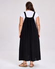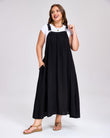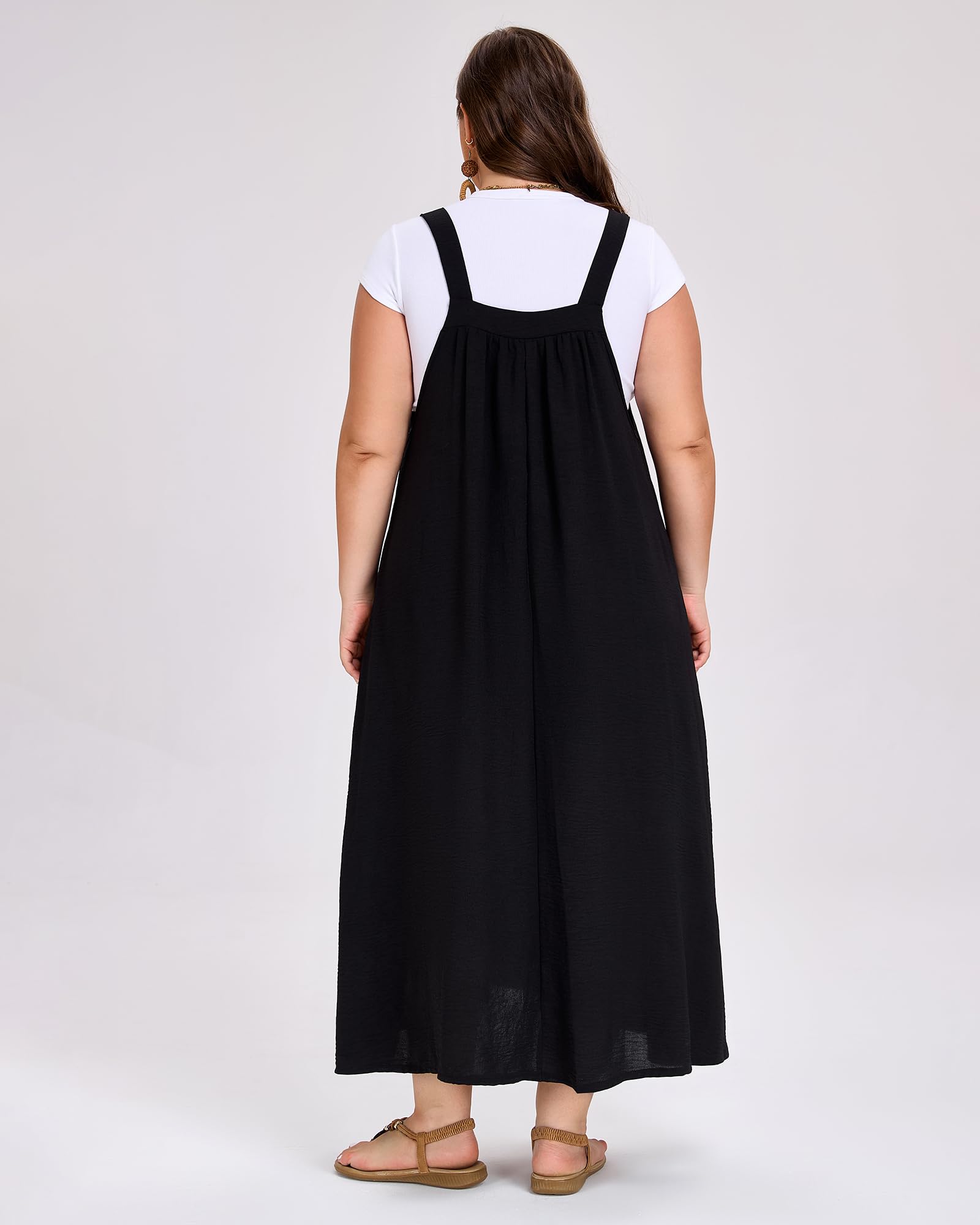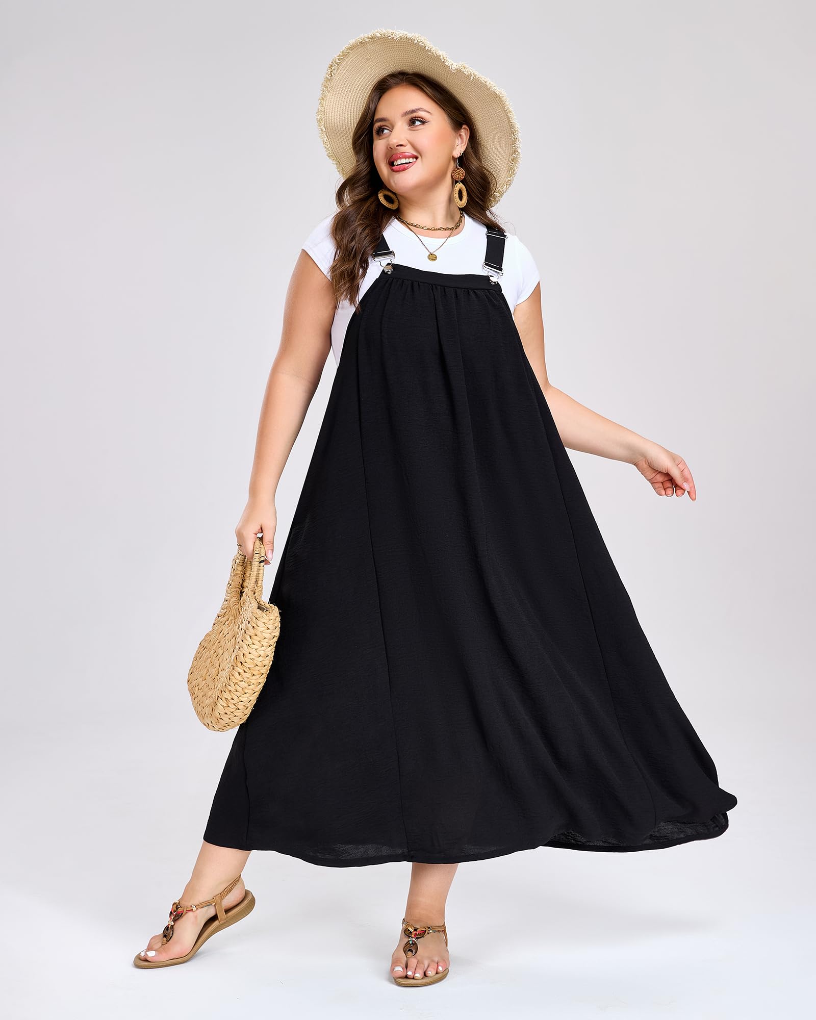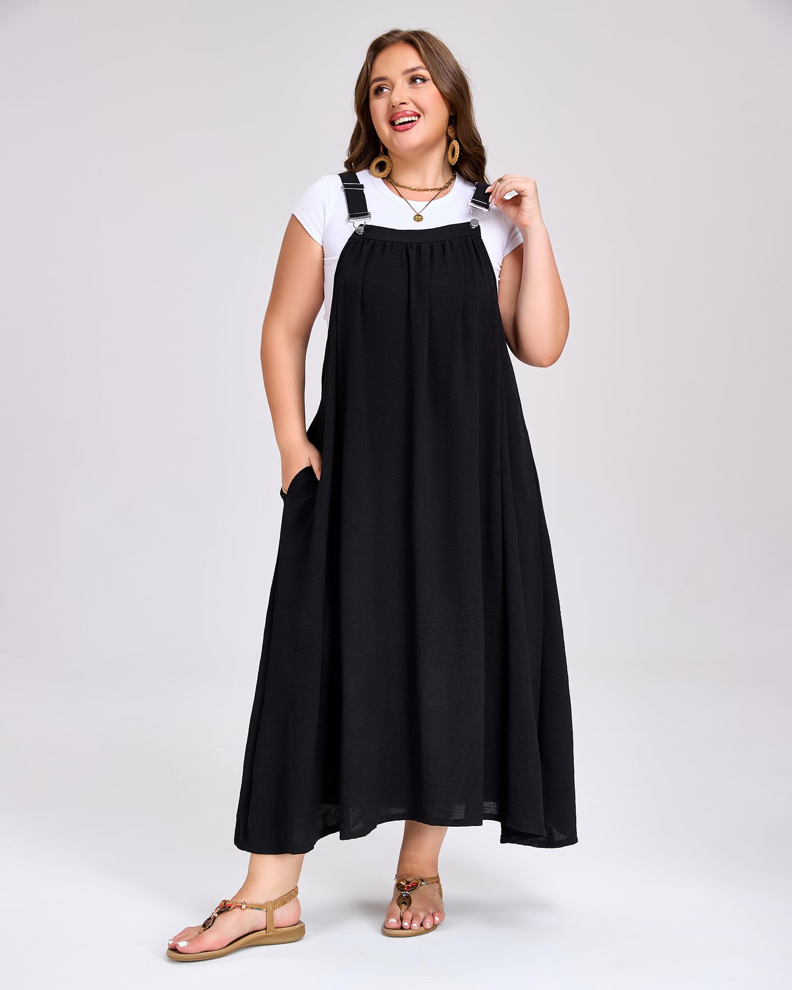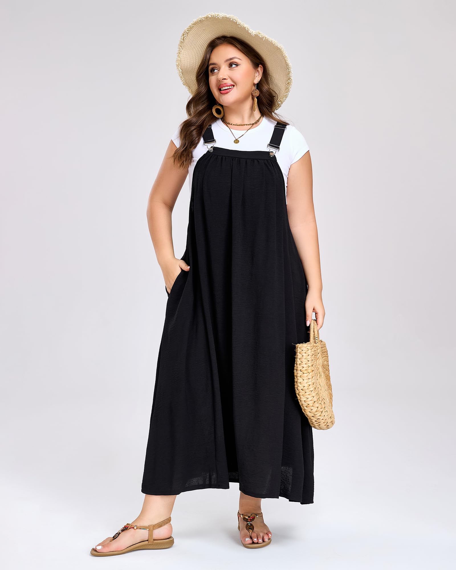 Embrace effortless, bohemian elegance with Moon Wood's Plus Size Overall Dress. This flowy A-Line maxi dress features a beautiful floral print on a minimalist silhouette, perfect for a stylish summer. Designed for both comfort and function, it includes adjustable metal buckle shoulder straps for a perfect fit and two convenient side pockets. Combining feminine charm with practical design, this black floral dress allows you to move freely and feel confident and beautiful in any setting.