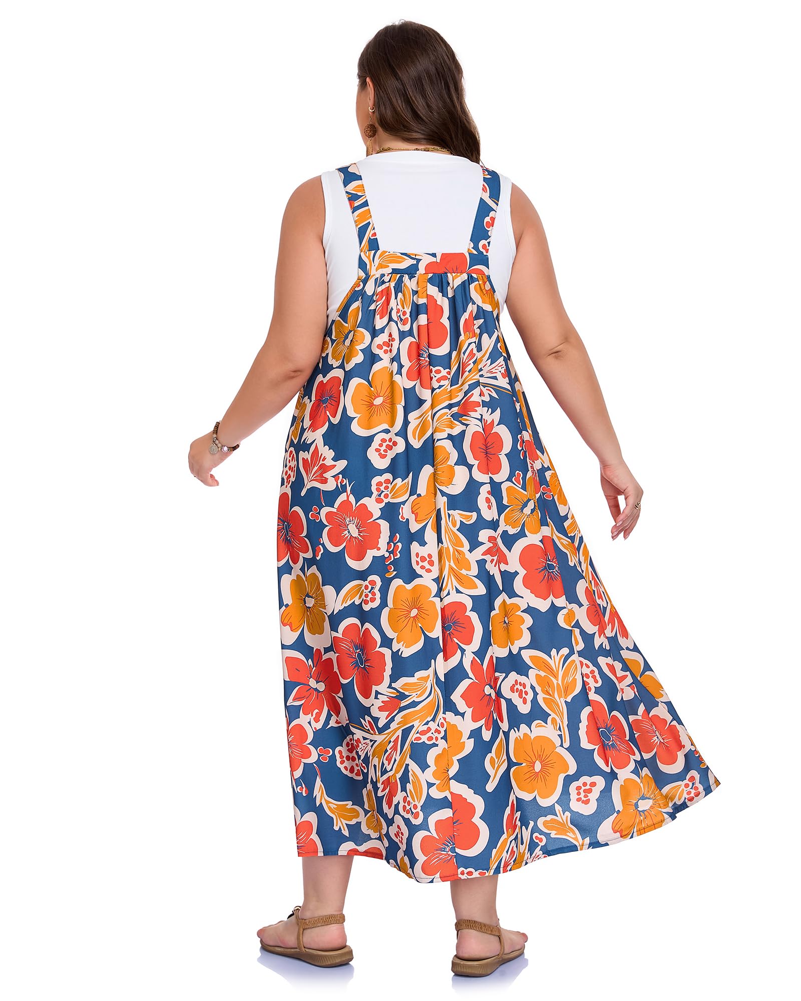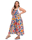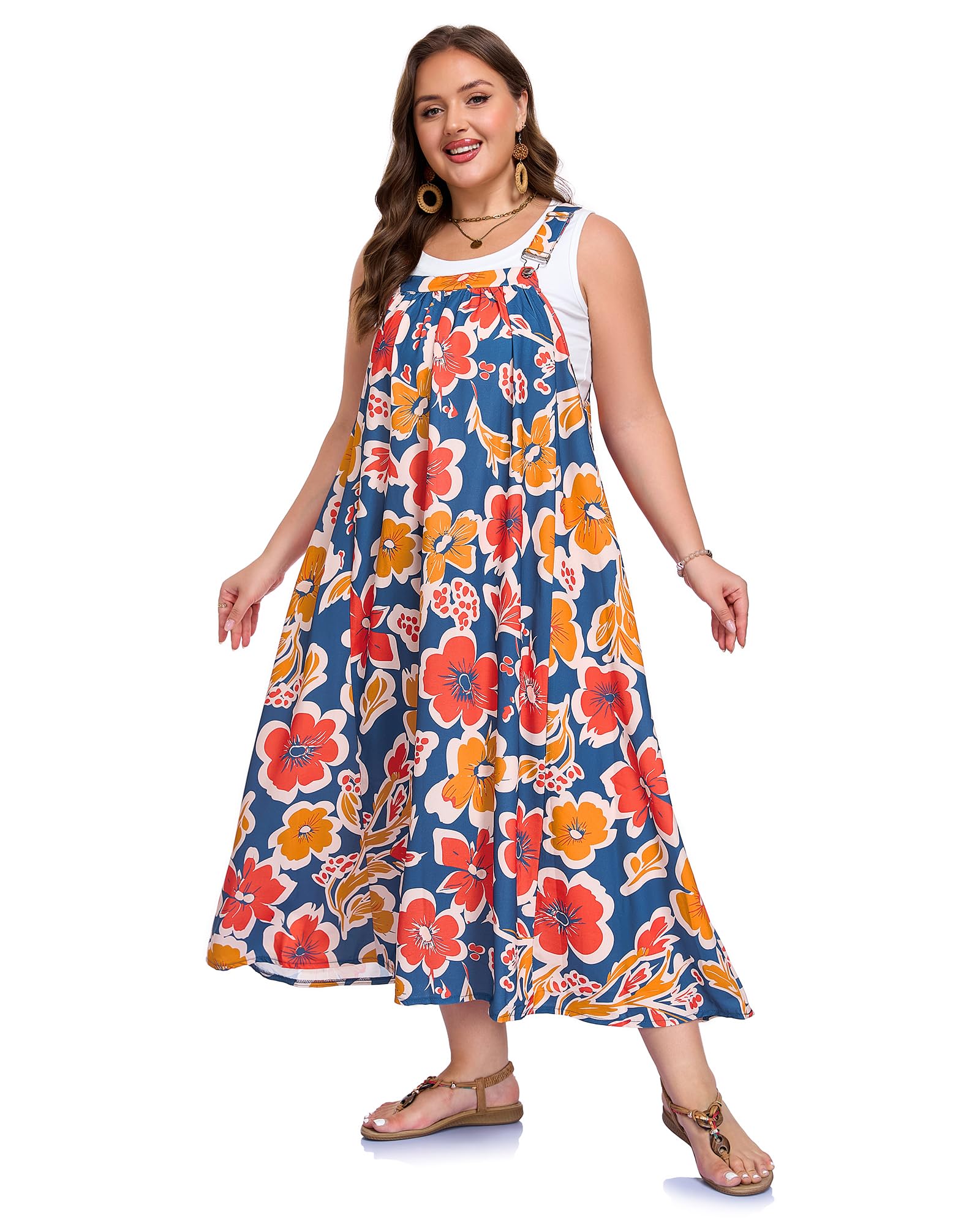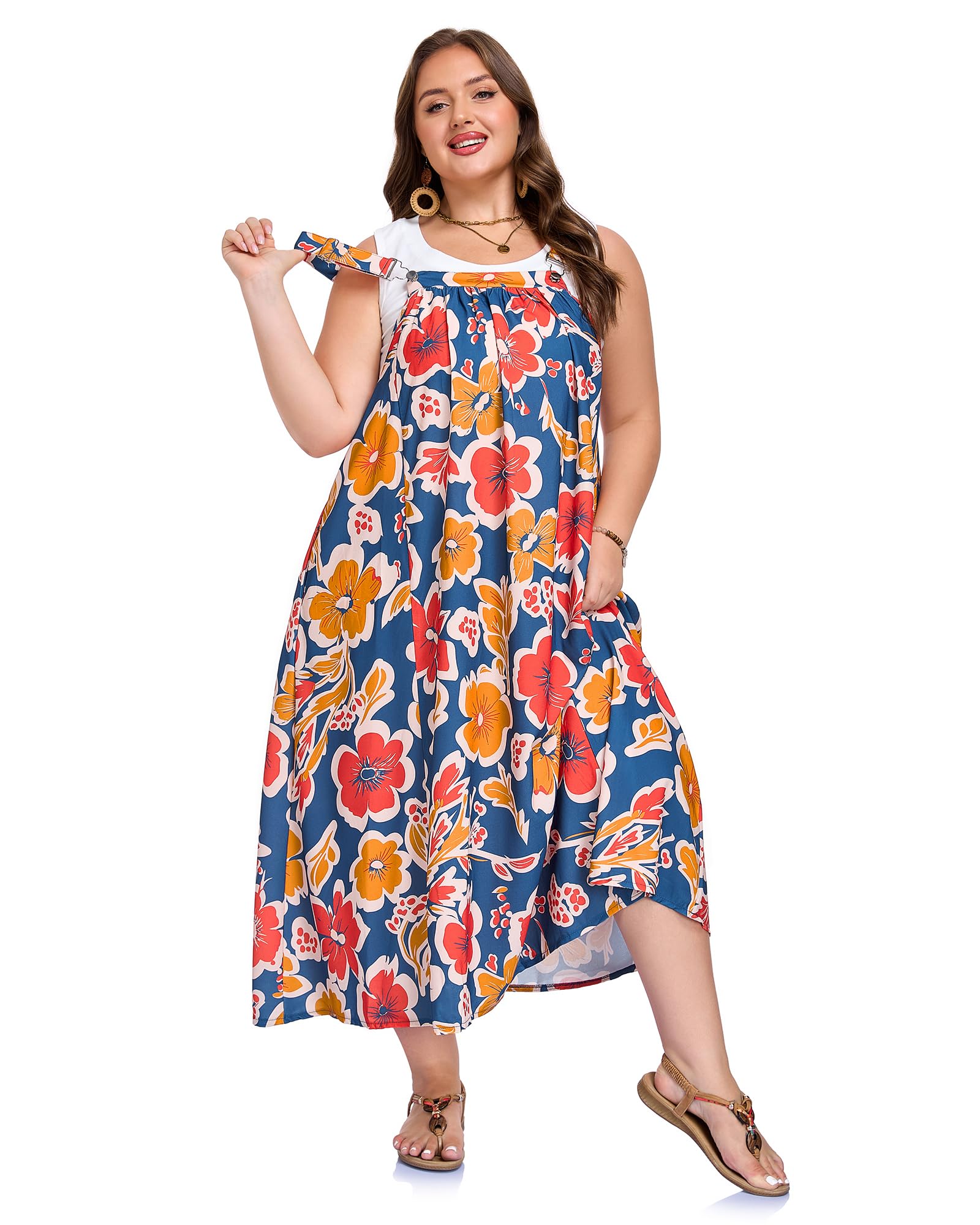 Embrace effortless, boho-chic style with the Moon Wood Plus Size Overall Dress. This flowy A-Line maxi dress is designed for summer, featuring a beautiful minimalist floral print in a sophisticated Navy, Red, and Brown color palette. Crafted for both comfort and style, it includes adjustable metal buckle shoulder straps for a perfect fit and two convenient side pockets to carry your essentials. Combining functionality with feminine elegance, this floral maxi dress allows you to move freely and feel beautiful and self-assured in every setting.