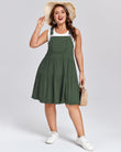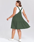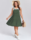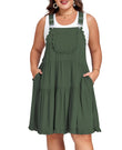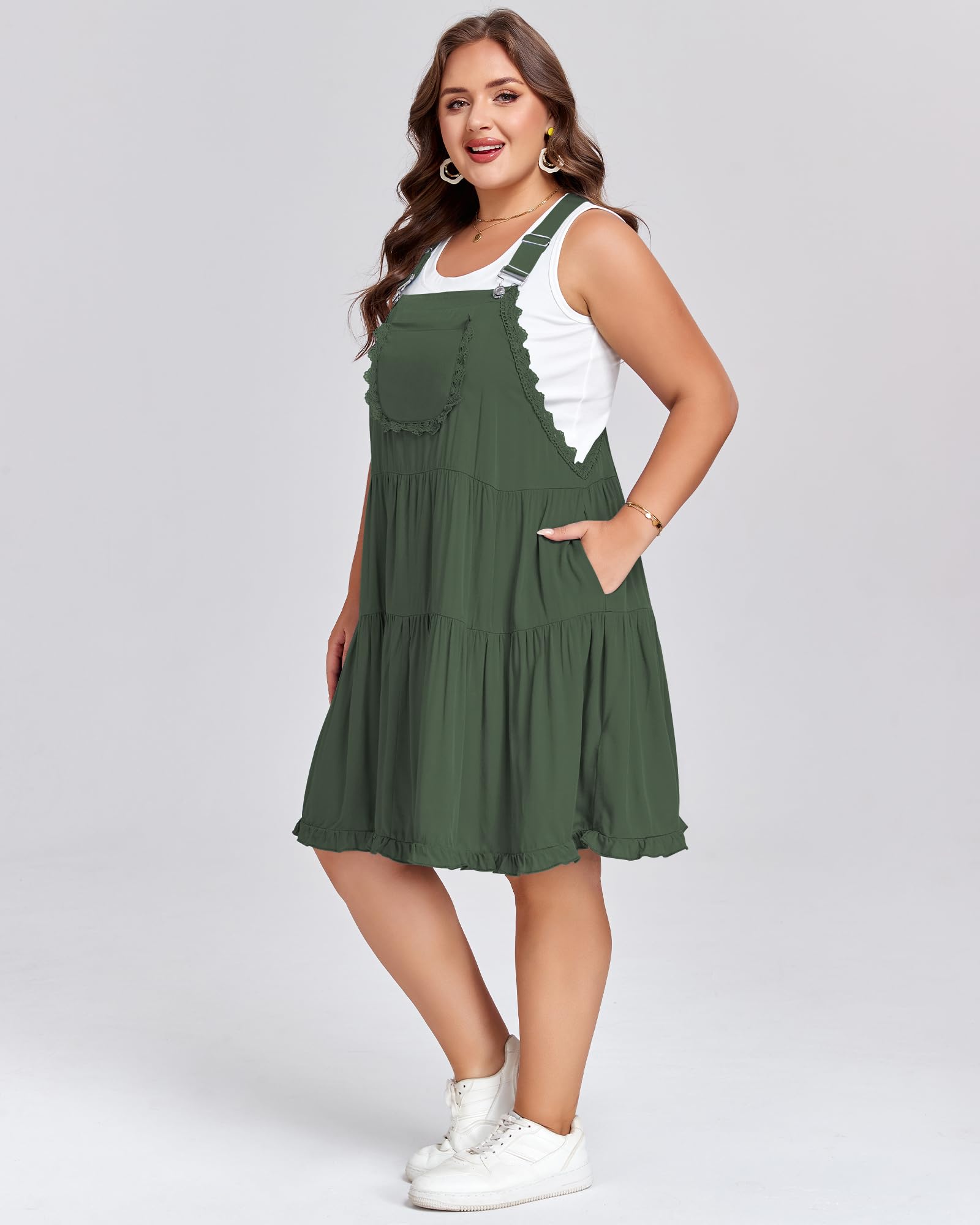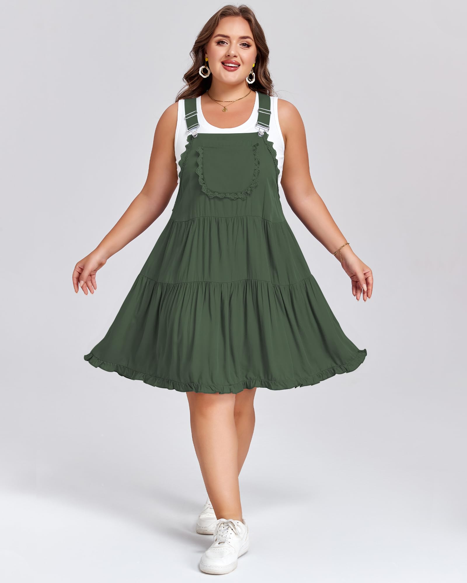 Introducing the Moon Wood Plus Size Overall Dress with delicate lace trim in Army Green. This charming mini dress is your go-to outfit for effortless style from morning to night. Designed for all-day comfort, its breathable, lightweight fabric and above-knee length keep you cool and mobile. Perfectly versatile, layer it over a tee for errands, pair with a long-sleeve for a cozy coffee date, or wear it solo with sandals as a chic vacation dress or beach cover-up. Ideal for hiking, theme park adventures, or stylish lounging.