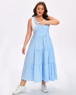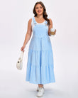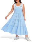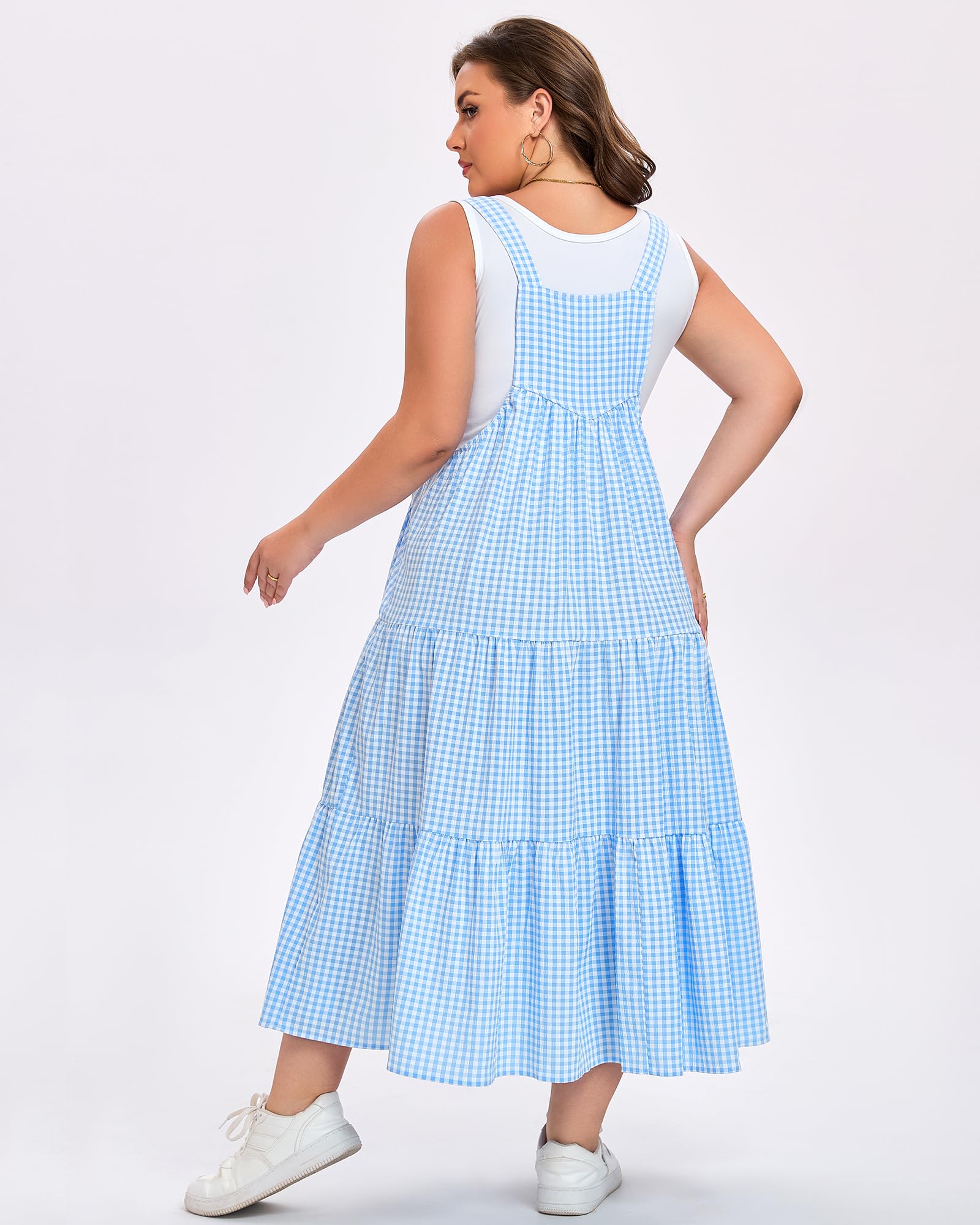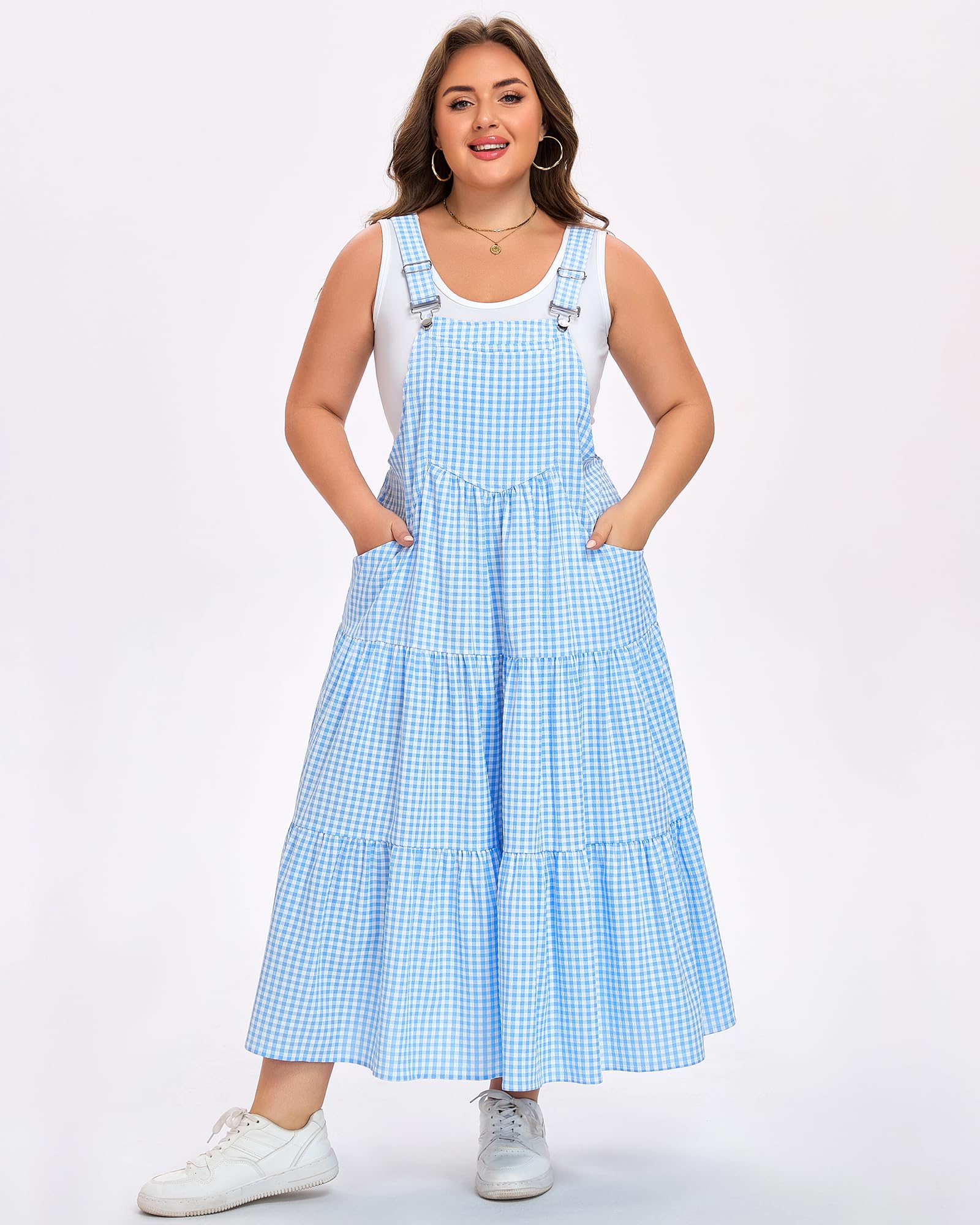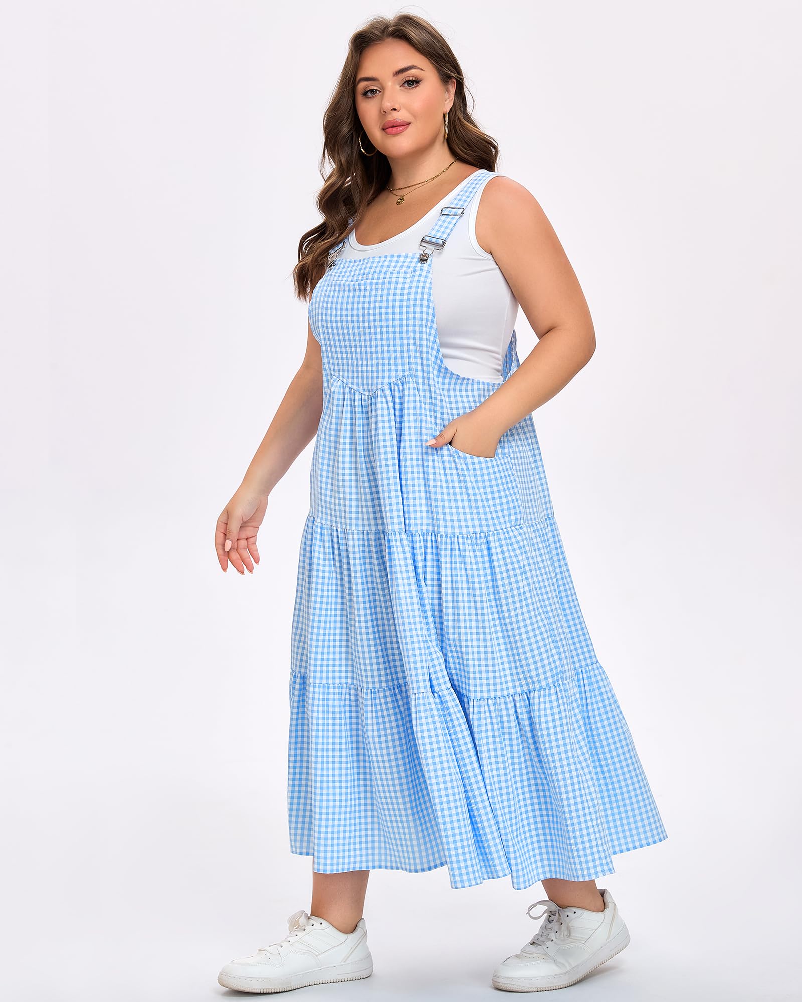 Discover effortless style in Moon Wood's Plus Size Plaid Overall Dress in Sky Blue. Designed to flatter, this dress features a loose A-line silhouette with a clever V-shaped waist and delicate back pleats that refine your shape for a streamlined look. The tiered skirt adds a vibrant, elegant touch, while adjustable wide straps ensure a perfect fit. Perfectly practical, it includes one chest pocket and two side pockets to keep your daily essentials close. A harmonious blend of comfort, style, and functionality for any occasion.