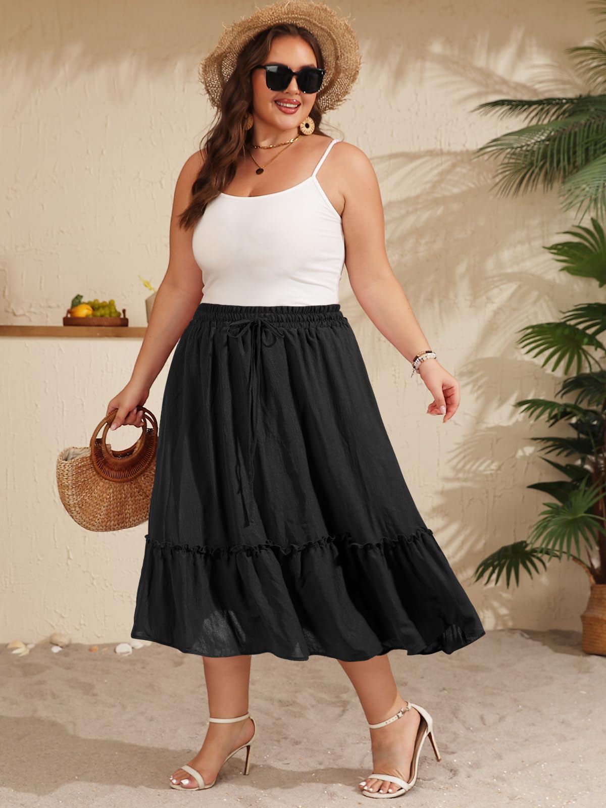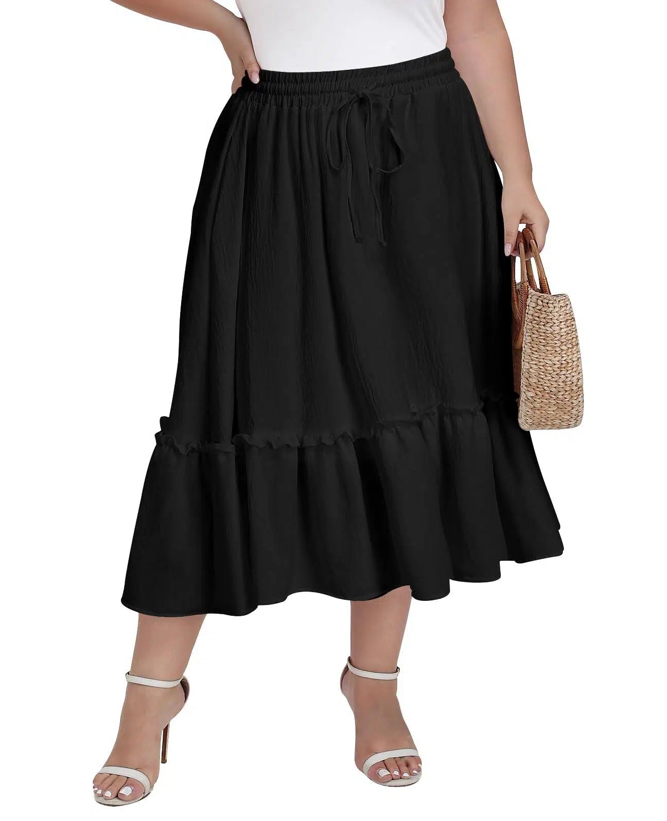 Discover the perfect blend of comfort and chic design with our Plus Size Ruffle Midi Skirt. Crafted for confidence, this elegant black skirt features a flattering midi length and a beautiful ruffle detail that adds a touch of feminine flair to any outfit. Made from a premium blend of 95% Polyester and 5% Spandex, it offers a soft, comfortable feel with just the right amount of stretch for a perfect, move-with-you fit. The elastic waistband ensures all-day ease without sacrificing style.