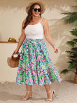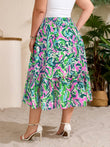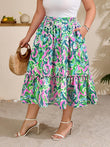 Plus Size Ruffle Midi Skirt with Pockets - Green Pink Painterly