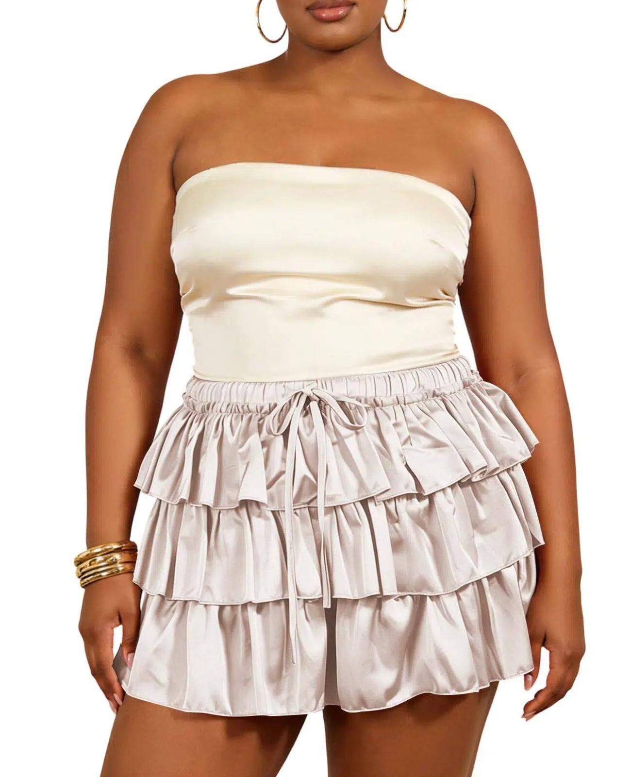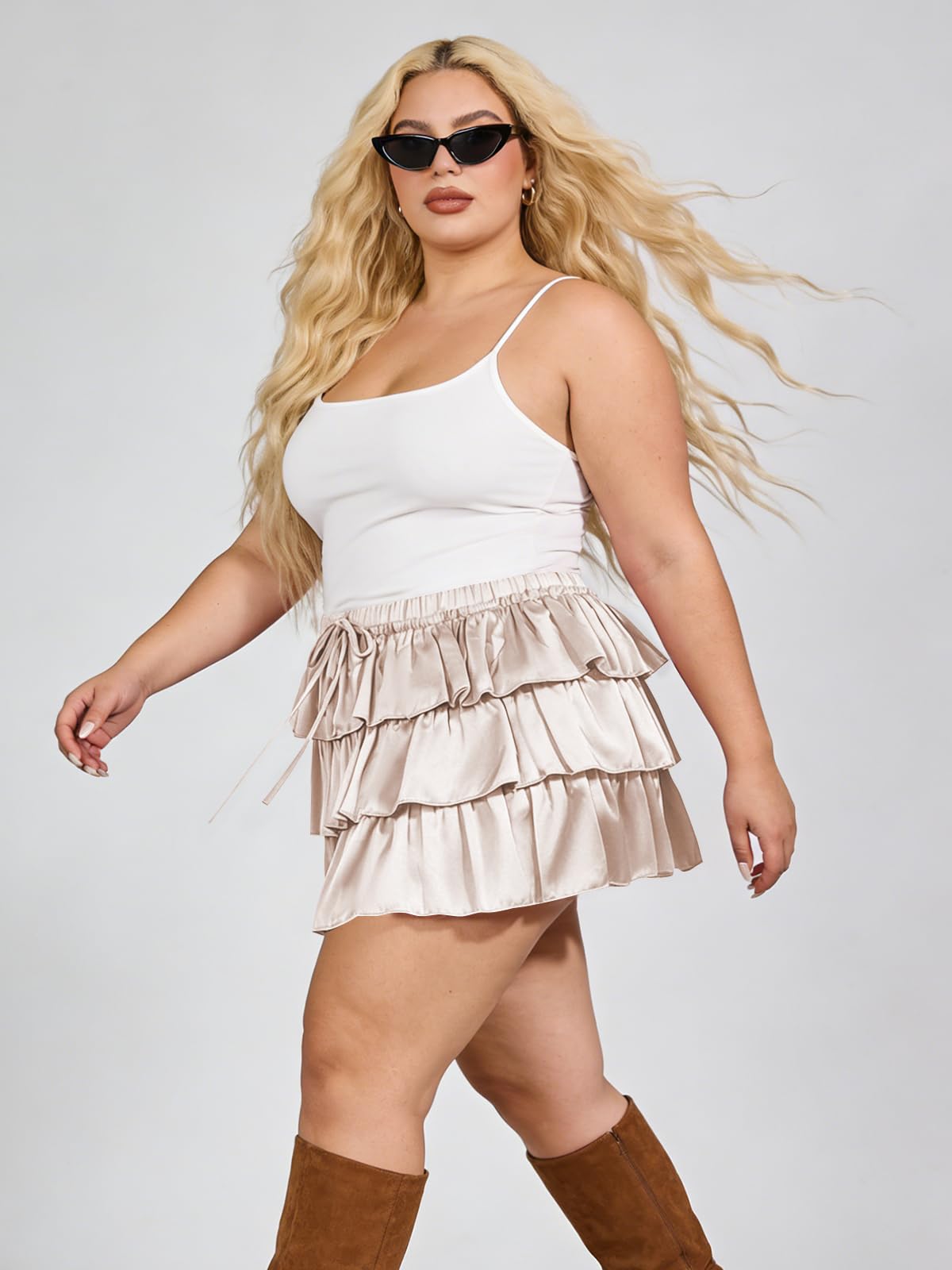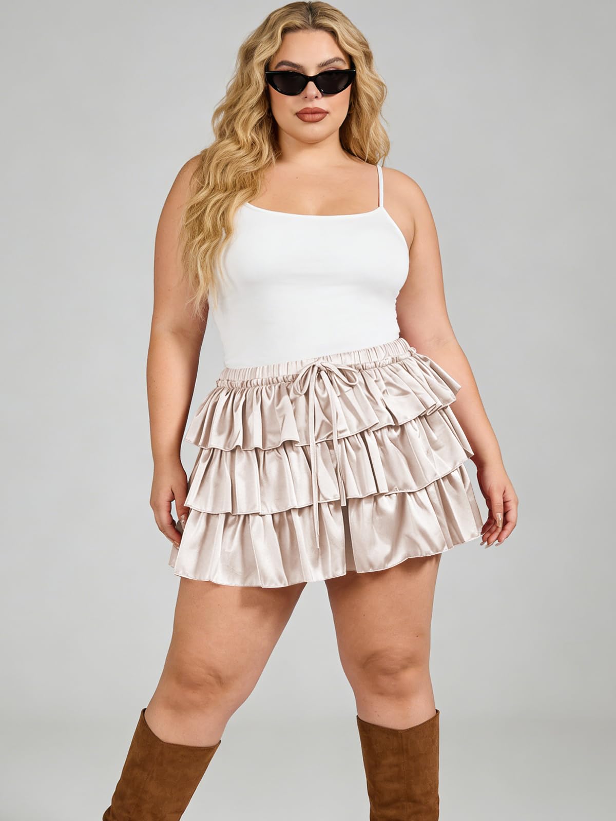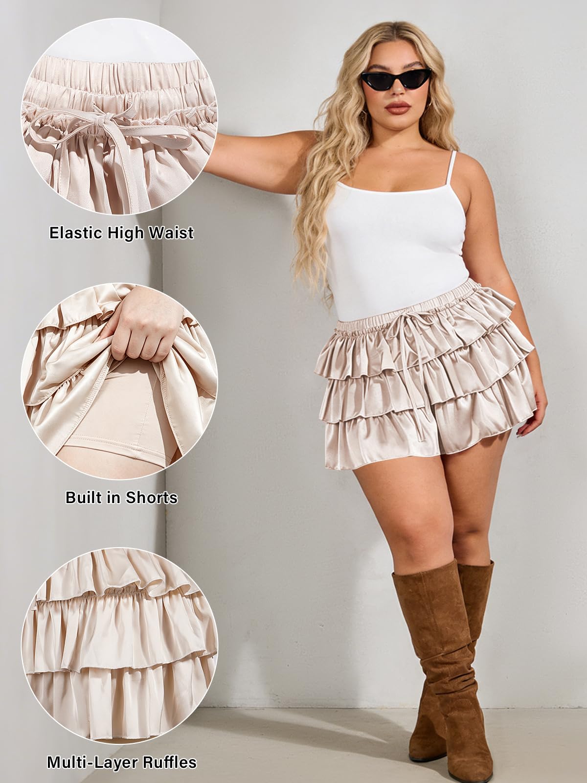 Elevate your wardrobe with the Moon Wood Plus Size Ruffle Mini Skirt Tiered Flowy in soft beige. This women's mini skirt blends flattering plus-size design with tiered ruffles for a breezy, feminine vibe—perfect for summer outings. Crafted from lightweight, breathable fabric with built-in shorts, it delivers comfort, coverage, and effortless style.