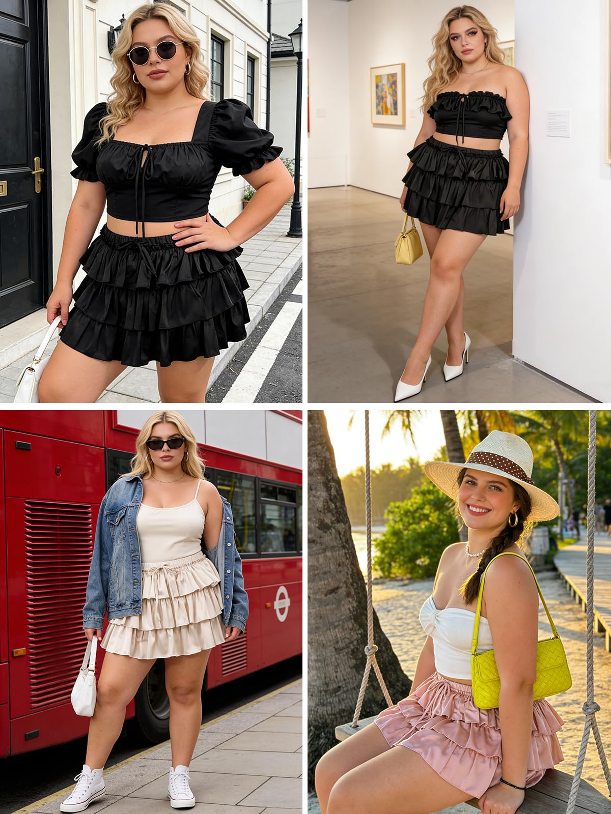 Elevate your summer wardrobe with the Moon Wood Plus Size Ruffle Mini Skirt Tiered Flowy in Light Pink. Perfect for plus-size women seeking a cute, flowy mini skirt that's non-see-through, chafe-free, and made from premium acetate.