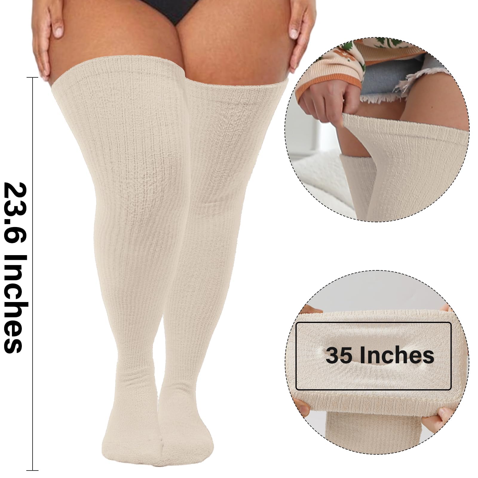 One Size: These plus size thigh high socks stretch from 25.6 to 40 inches in length, with a thigh circumference that extends up to 37 inches.