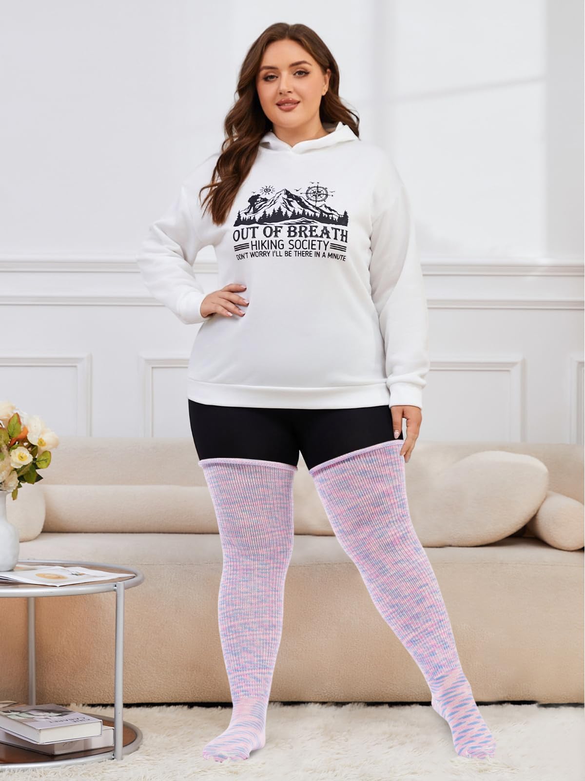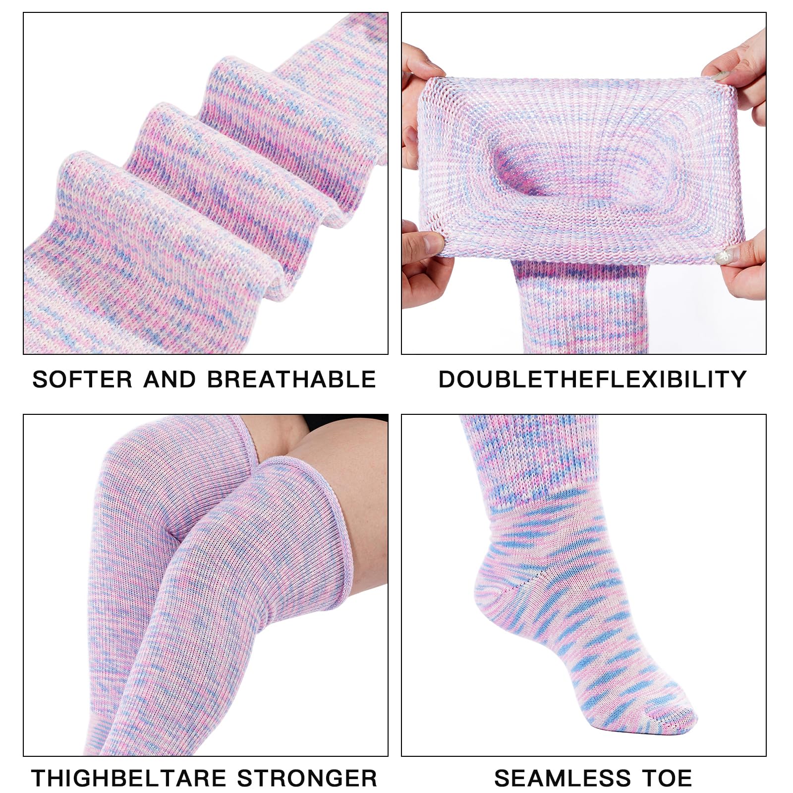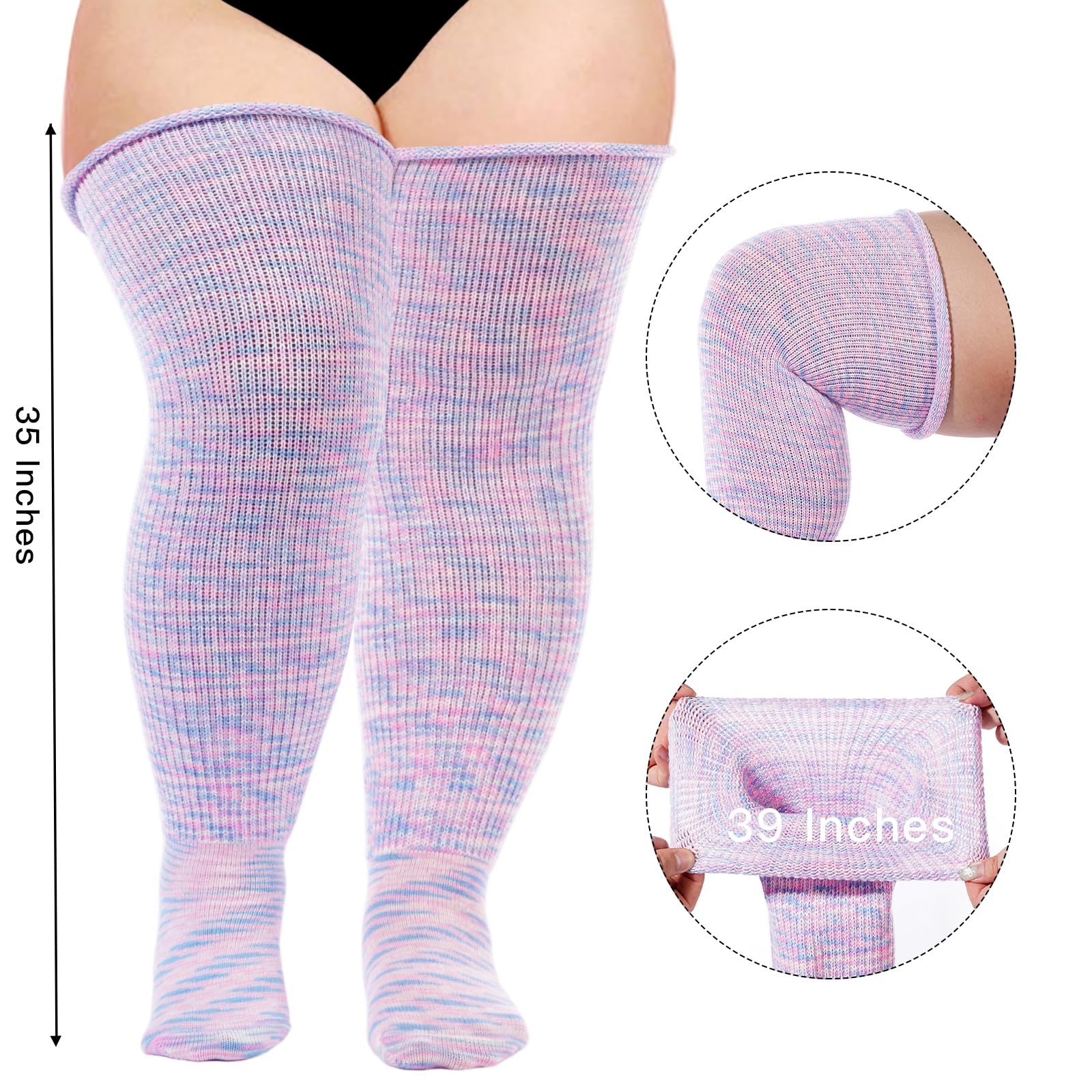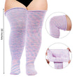 Moon Wood's Plus Size Thigh High Socks in a vibrant Pink Blue Tie Dye design are crafted from ultra-soft acrylic yarn for a gentle, skin-friendly feel. These thigh-highs provide cozy warmth without sacrificing breathability, keeping you comfortable all day long. Designed with superior elasticity, they hug your thighs and calves snugly, staying in place without slipping or sagging. The flattering fit visually elongates your legs, blending style and comfort effortlessly—so you can showcase your confidence with every step.