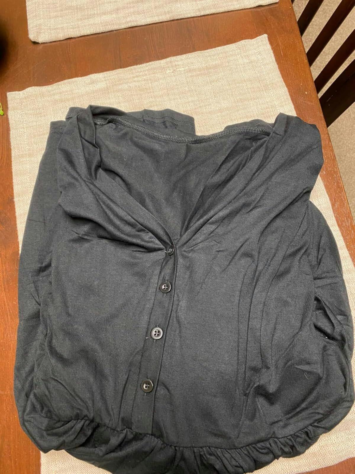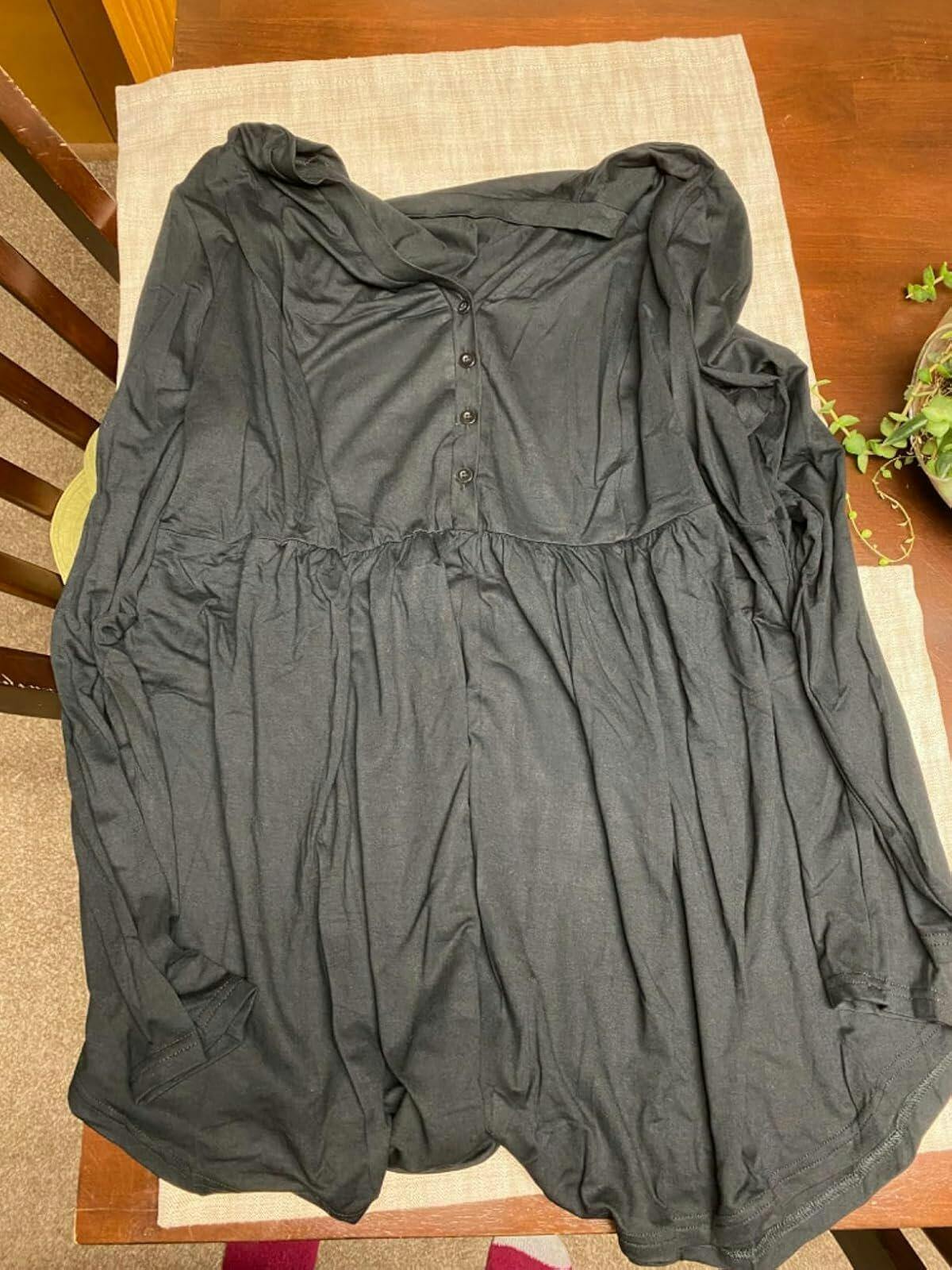 I wanted a nice simple long sleeved shirt to wear for the holidays, and this Henley delivered. It is made of a soft, silky material, while also having the stretch needed to make it comfortable. It is true to size, and fit fine over my bigger than average chest. The back of it has a gather that is really pretty, and I liked how the sides came up in almost a baseball tee kind of cut. The buttons are securely seen on the top too, so there is no worry about busting one. It is a nice dark black (despite my photos washing out the color lol), and washes well. It is a great shirt and I think it’s worth the price.