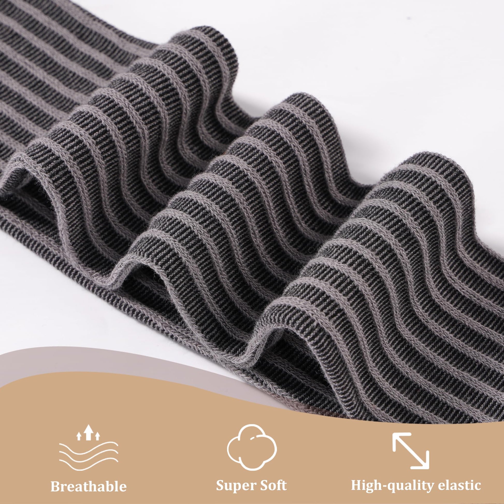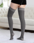 Elevate your style with Moon Wood's Thigh High Socks in Grey. Featuring delicate vertical stripes with a raised knitted texture, these socks add subtle dimension to any outfit. The slimming vertical lines are designed to visually lengthen and straighten your legs, flawlessly enhancing your proportions. More than just a warm accessory, these socks blend style with functionality, transforming your everyday look into a confident, flattering statement. Perfect for adding a chic touch to your wardrobe.