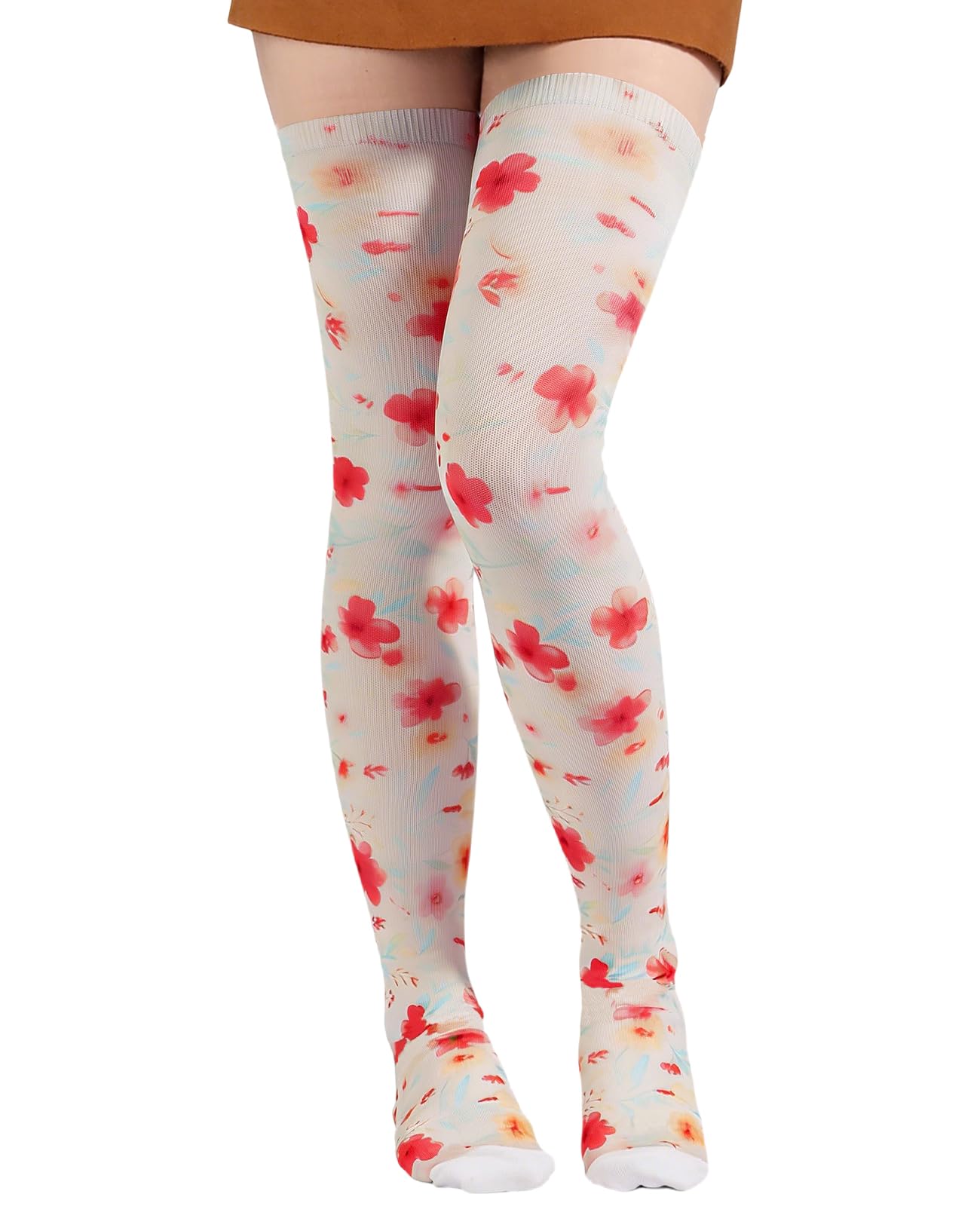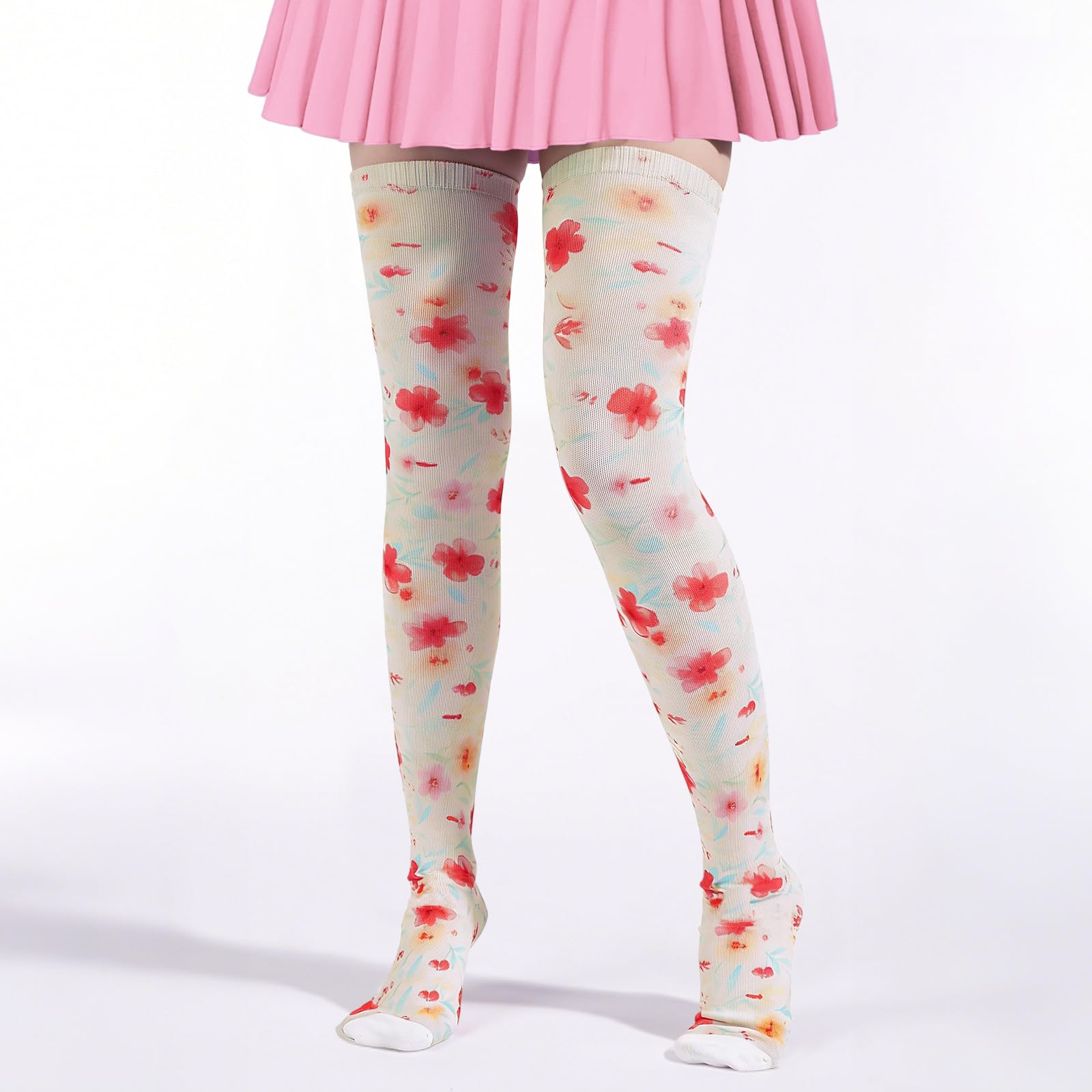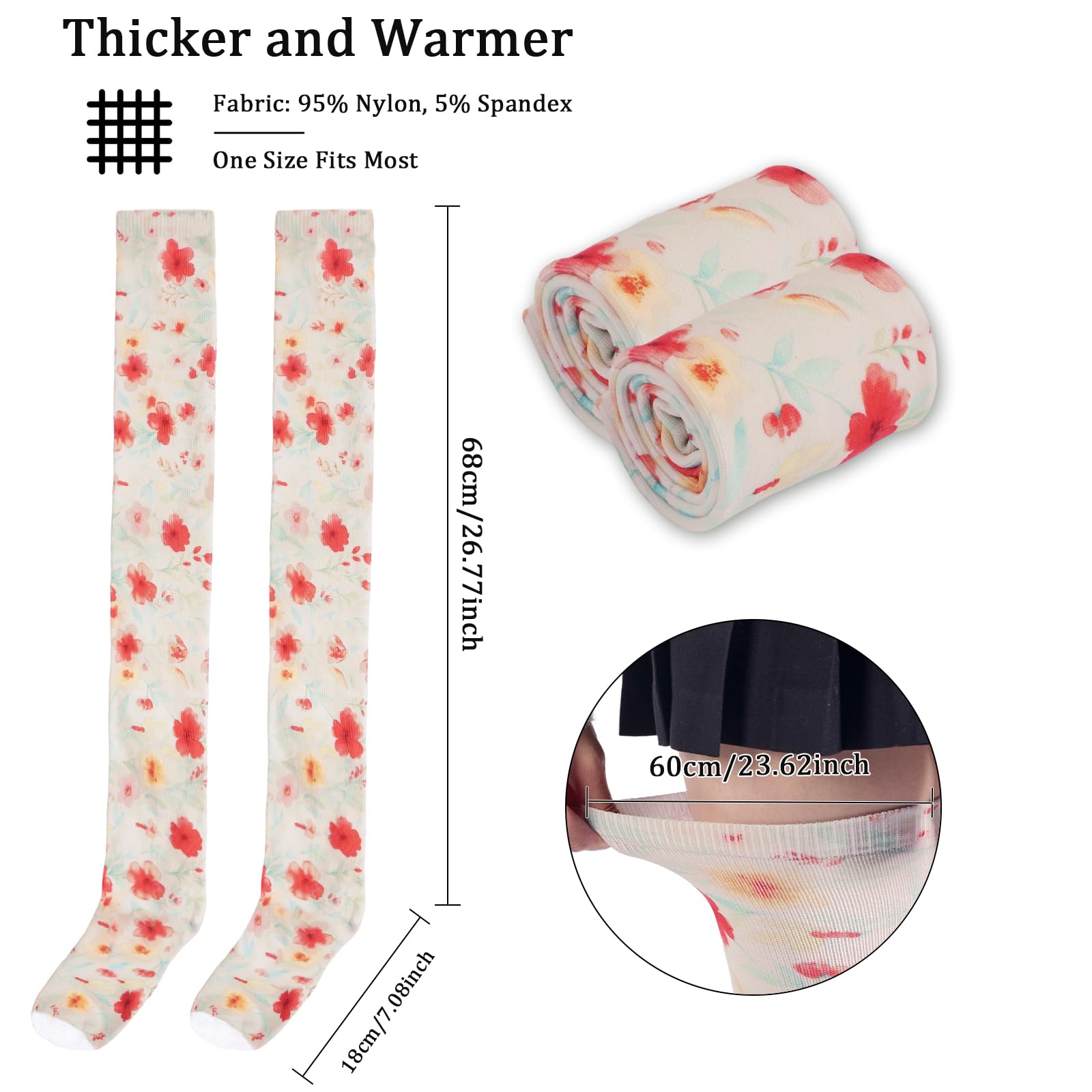 Embrace fresh floral charm with Moon Wood's "Watercolor Petals" thigh high socks. Featuring delicate, lovely small floral prints on a soft color palette, these socks exude a sweet and gentle vibe perfect for spring through autumn. Designed to add a feminine touch to your outfits, they pair beautifully with floral skirts, denim shorts, sundresses, and knee-high boots. Crafted to be warm and ultra-soft, these novelty socks are a favorite for adding an understated, dainty aesthetic to your casual, picnic, or everyday looks.